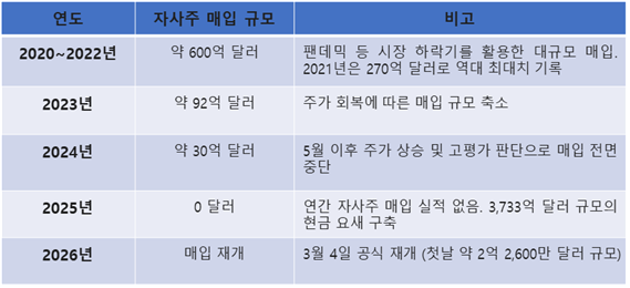 버크셔의 자사주 매수는 2024년 5월 이후 22개월 만에 처음이다. 버크셔는 2020년 코로나 팬데믹으로 주가가 크게 하락했을 때 자사주를 매규모로 매수하기 시작했다. 2021년에만 270억 달러의 자사주를 매수했고 이후 2023년과 2024년 5월까지도 120억 달러 이상의 자사주를 사들였다. 2024년 5월 이후에는 미국 시장에 대한 고평가 논란이 불거지면서 지금까지 자사주 매입이 전면 중단됐었다.