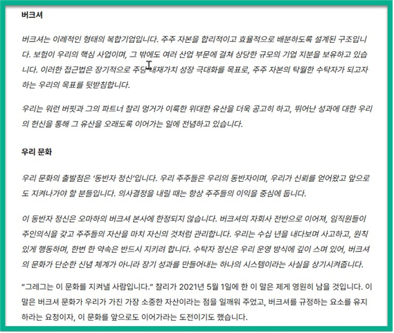 에이블은 주주 서한에서 버크셔의 문화를 가장 소중한 자산으로 규정했다. 특히 찰리 멍거가 생전에 “그레그가 문화를 지켜낼 사람”이라는 발언을 언급하면서 창업자들이 구축한 주주와의 동반자 관계를 영구히 이어가겠다고 선언했다. 에이블이 세후 급여 전액을 회사 주식 매입에 투입한 것은 CEO 스스로 주주들과 완벽하게 동일한 재무적 운명을 공유하겠다는 강력한 의지의 실천으로 해석해야 할 것이다.