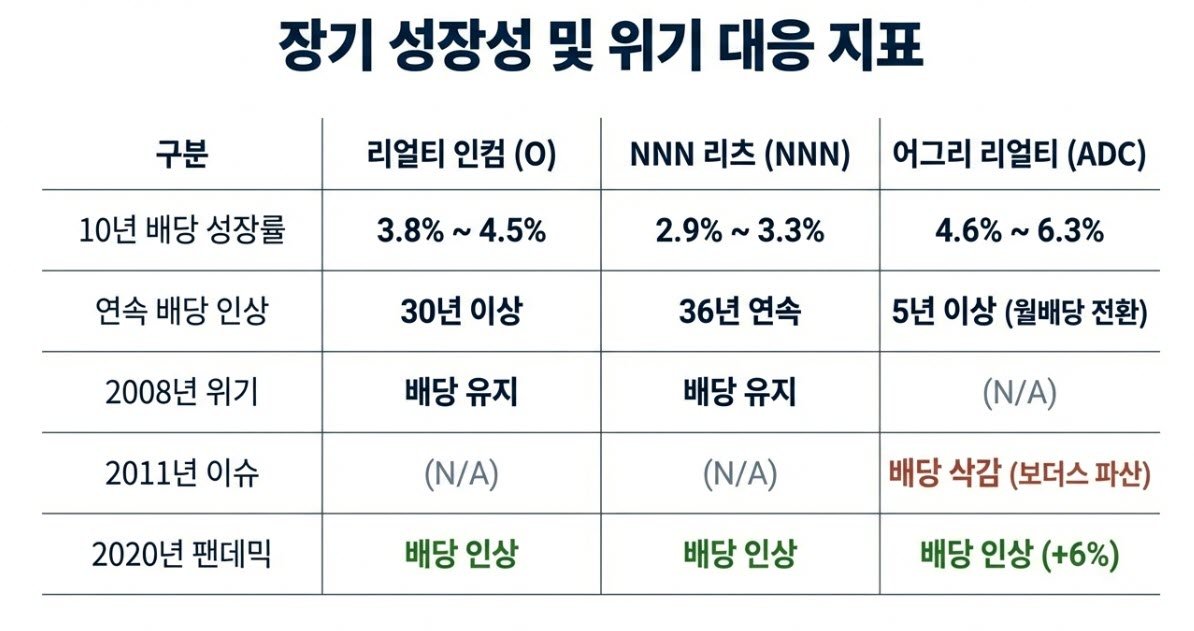 리얼티인컴과 NNN 리츠는 2008년 서브프라임 모기지 사태와 2020년 코로나19 팬데믹이라는 전례 없는 두 번의 경제 위기 속에서도 단 한 차례의 배당 삭감 없이 오히려 배당금을 인상하는 압도적인 방어력을 증명했다. 2008년 미국 전역의 부동산 가격이 폭락하고 금융 기관이 파산할 때도, 이들의 임차인인 편의점과 약국, 식료품점은 문을 열고 정상적으로 임대료를 납부했다. 2020년 팬데믹 당시 주 정부의 강제 영업 정지 조치가 내려졌을 때도 이들 포트폴리오의 대부분은 정부가 지정한 '필수 영업장'에 해당하여 폐쇄를 면할 수 있었으며, 이는 즉각적으로 주주들의 배당을 수호하는 방패막이가 되었다.