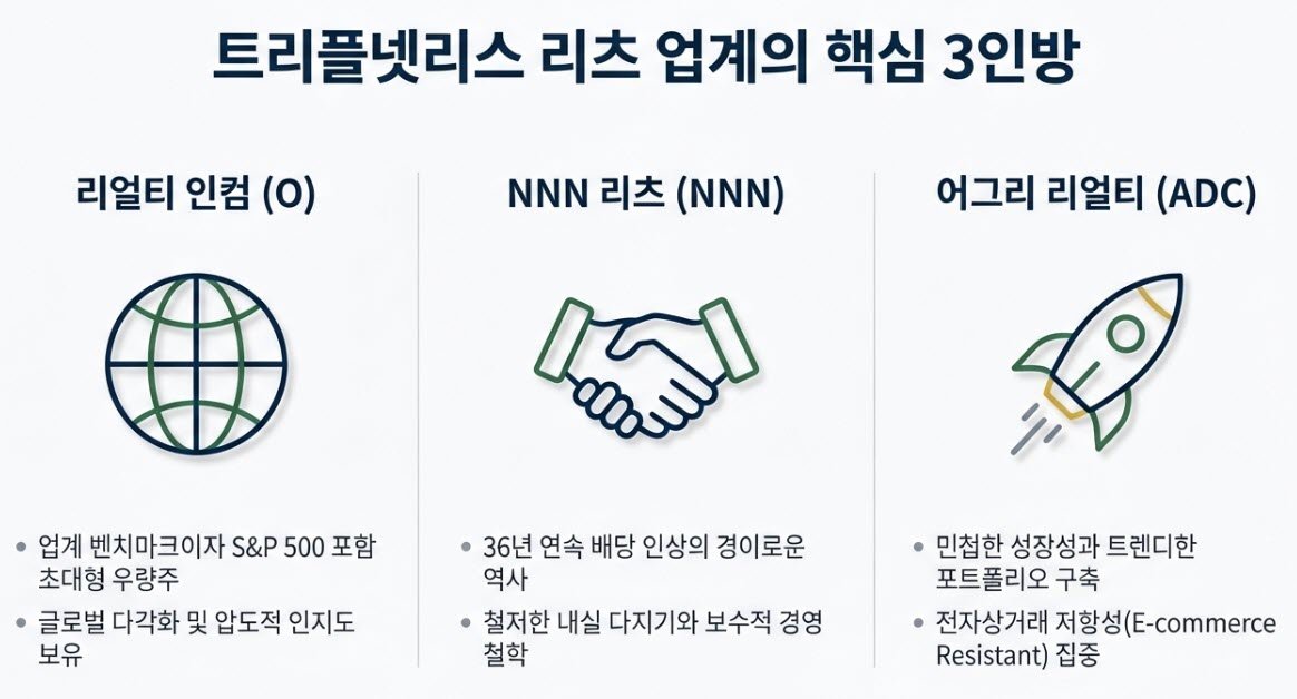 트리플넷리스의 계약 구조는 실물 부동산에 '인플레이션 위험 전가'라는 정교한 금융 공학적 날개를 달아준 현존하는 가장 우월한 현금 창출 모델이다. 이 구조를 통해 투자자들은 건물 관리의 골칫거리 없이, 우량한 기업들이 지불하는 장기적인 채권 이자와 같은 막대한 현금흐름을 누릴 수 있다. 거대한 자본력과 글로벌 다각화를 바탕으로 매월 어김없이 절대적인 안정의 현금을 쏟아내는 리얼티 인컴(O), 화려함보다는 내실을 다지면서 36년이라는 경이로운 세월 동안 주주와의 배당 인상 약속을 지켜낸 NNN 리츠(NNN), 그리고 과거 시련을 딛고 전자상거래와 AI 시대에 가장 완벽한 면역 체계를 구축한 채 무서운 속도로 팽창해 나가는 어그리 리얼티(ADC)는 각각의 독특한 장점이 있는 리츠이다. 투자자 각자의 생애주기와 재무적 목표에 맞추어 이 세 기업의 비중을 정교하게 조율하고 포트폴리오를 구축한다면, 향후 주식 시장의 급격한 변동성을 헤쳐 나갈 수 있는 듬직한 배당 요새를 완성할 수 있을 것이다.