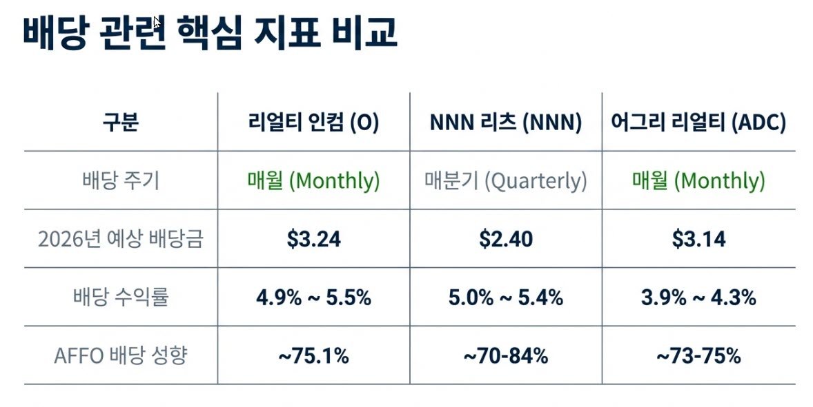 2026년 2월 현재 주가를 기준으로 산출된 배당수익률은 시장이 이들 기업의 밸류에이션을 어떻게 평가하는지를 적나라하게 보여준다. 리얼티 인컴은 연간 주당 약 3.24달러의 배당을 선언하며 약 4.9%에서 5.5% 사이의 높은 배당수익률 구간을 형성하고 있다. NNN 리츠 또한 연간 2.36달러에서 2.40달러 수준을 지급하여 약 5.0%에서 5.4%에 달하는 고배당을 제공한다. 반면, 어그리 리얼티는 연간 약 3.14달러를 지급함에도 불구하고 배당수익률은 상대적으로 낮은 3.9%에서 4.3% 대에 머물러 있다.