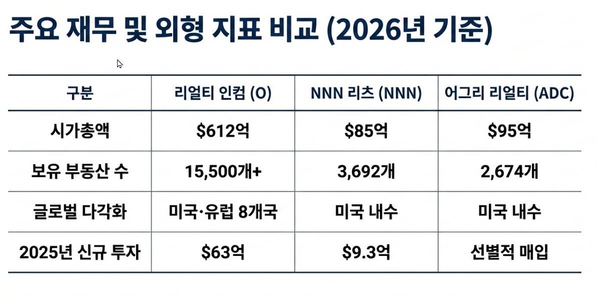 리얼티 인컴(O)은 S&P 500 지수에 편입된 명실상부한 업계의 벤치마크이자, 전 세계 리츠를 통틀어 가장 높은 인지도를 자랑하는 초대형 우량주이다. 반면 NNN 리츠(NNN)는 무려 36년 연속으로 배당금을 인상해 온 경이로운 역사를 지니며, 외형 확장보다는 철저한 내실 다지기와 지역 관계망 형성에 집중하는 보수성의 극치를 보여주는 기업이다. 마지막으로 어그리 리얼티(ADC)는 상대적으로 작은 체급을 활용하여 가장 선별적이고 트렌디한 포트폴리오를 구축함으로써, 경쟁사들을 압도하는 배당 성장률과 총수익률을 기록 중인 넷리스 업계의 가장 역동적인 도전자이다.