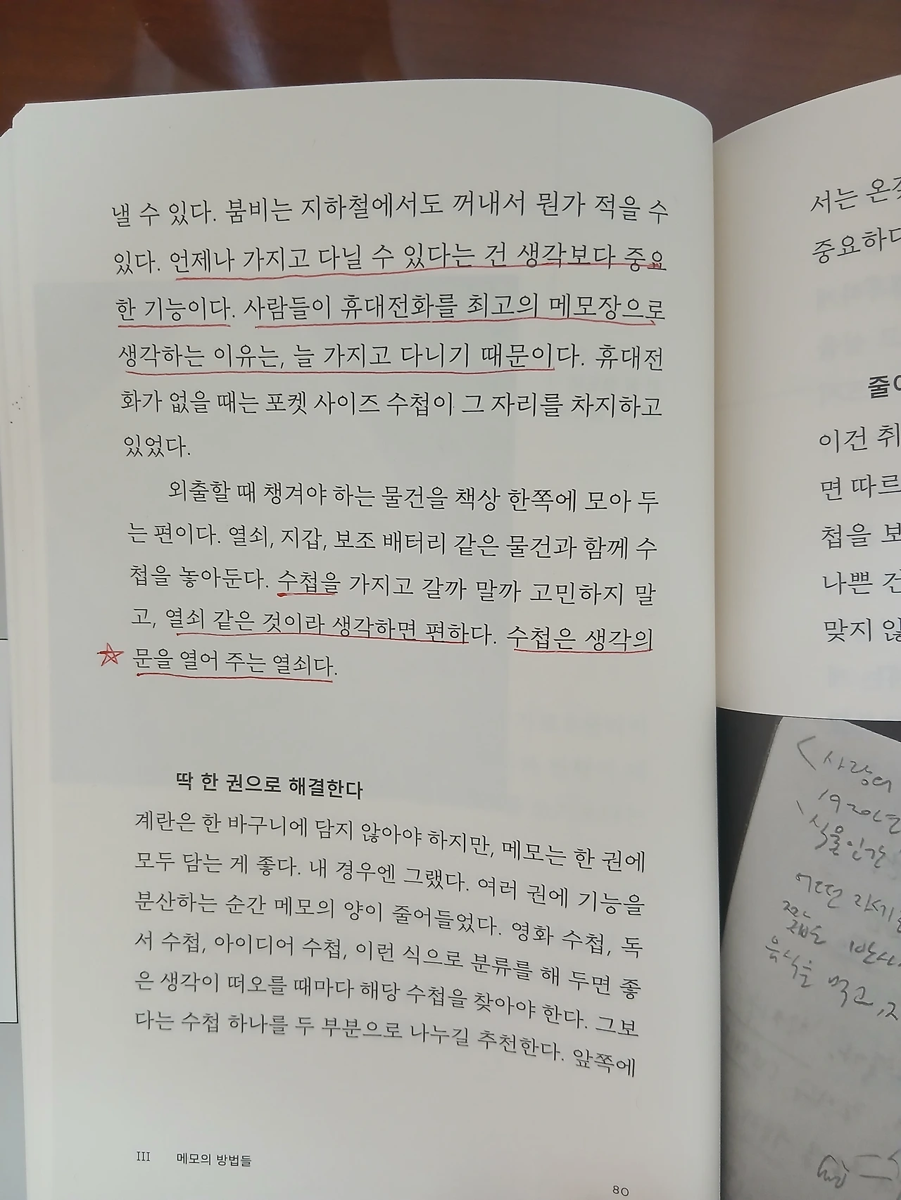 - 언제나 가지고 다닐 수 있다는 건 생각보다 중요한 기능이다. ~ 수첩을 열쇠 같은 것이라 생각하면 편하다. 수첩은 생각의 문을 열어 주는 열쇠다.(p.80)