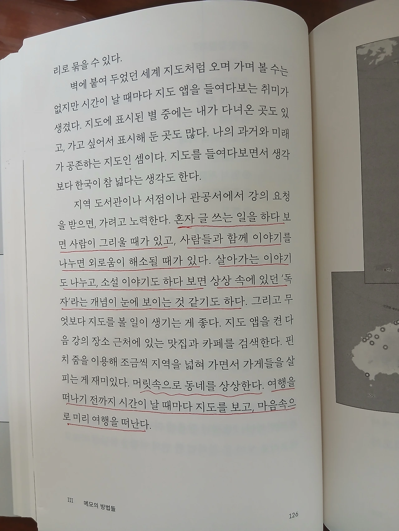 예상했던 대로 작가는 지도에 하는 메모법을 추천하고 있다. 예전에 읽었던 김중혁 작가의 "에스키모, 여기가 끝이야" 소설에 지도 이야기가 나온다. 내게 매우 인상적인 이야기였기에 지금 이 책 "미묘한 메모의 묘미"를 본 순간 분명 지도 이야기가 있을 것이라고 확신했다. 역시 그랬다. 예상이 틀리지 않아 입가에 흐뭇한 미소가 떠올랐다.