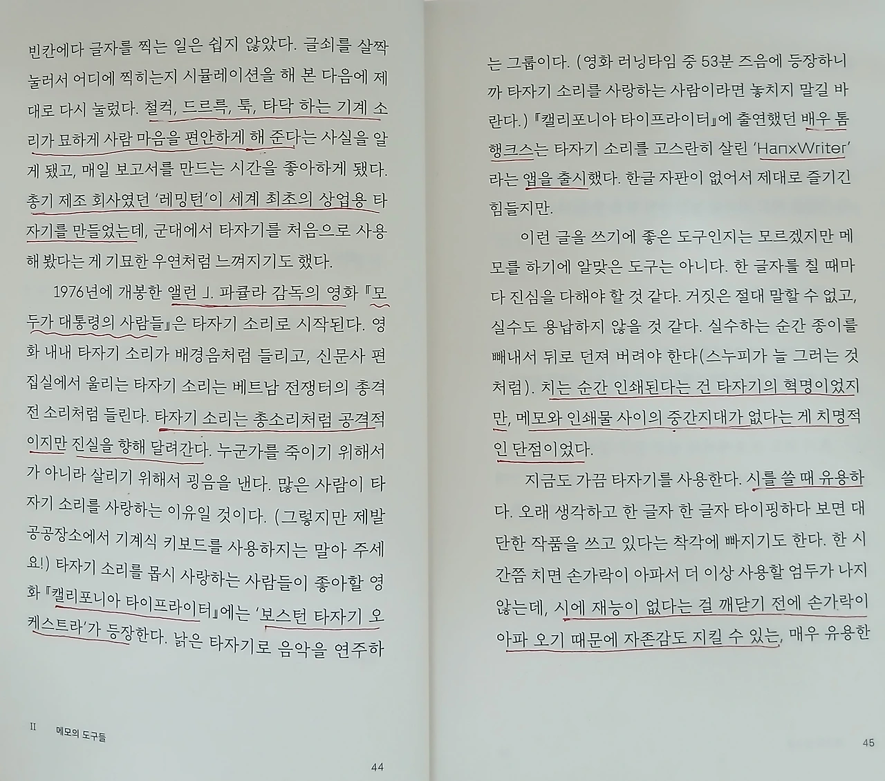 - 철컥, 드르륵, 툭, 타닥 하는 기계 소리가 묘하게 사람 마음을 편하게 해 준다. (p.44)
