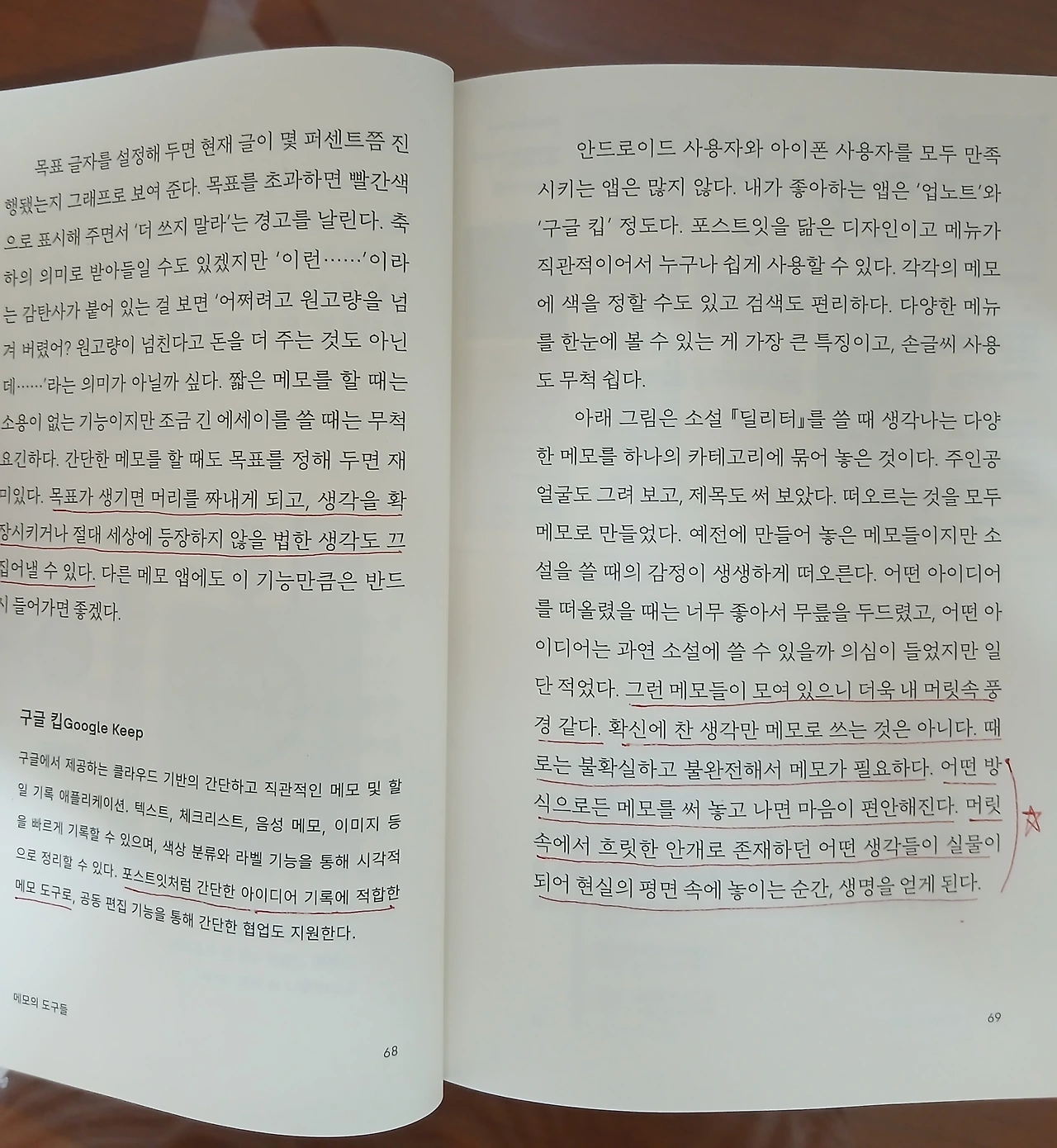 - 확신에 찬 생각만 메모로 쓰는 것은 아니다. 때로는 불확실하고 불완전해서 메모가 필요하다. 어떤 방식으로든 메모를 써 놓고 나면 마음이 편안해진다. 머릿속에서 흐릿한 안개로 존재하던 어떤 생각들이 실물이 되어 현실의 평면 속에 놓이는 순간, 생명을 얻게 된다. (p.69)