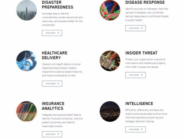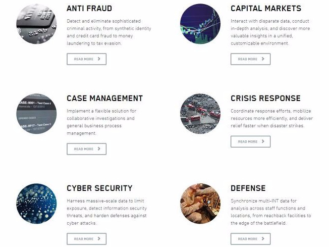 대표 제품인 PalantirGotham은 테러방지, 국가안보, 정보보안, 사기 방지 등을 위한 범죄 예측 데이터 분석 서비스이다. 사실, 팔란티어가 다루고 있는 분야는 매우 광범위하다. 사기 방지(ANTI FRAUD), 자본 시장(CAPITAL MARKETS), 사례관리(CASE MANAGEMENT), 위기 대응(CRISISRESPONSE), 사이버 보안(CYBER SECURITY), 방위(DEFENSE), 재난 대비(DISASTER PREPAREDNESS), 질병 대응(DISEASE RESPONSE), 의료서비스(HEALTHCAREDELIVERY), 내부 위협(INSIDER THREAT) 등이 그들이 다루고 있는 주요 분야이다.