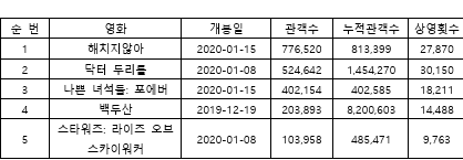 2020년의 첫 달이 끝나감을 알리는 설날이 다가오고 있습니다. 새해가 시작된 지 아직 20일밖에 되지 않았지만 벌써 여러 편의 영화들이 개봉하고 막을 내리기도 했습니다. 어떤 영화들이 한 주의 1위를 차지하고 어떤 영화가 흥행에 실패했는지 분석해보겠습니다.