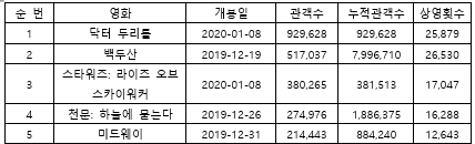 1월 1주 차는 여전히 12월에 개봉한 <백두산>의 여파가 남아 있습니다. 그 때문인지 새해 첫 주에는 새로운 얼굴들을 보기가 힘들었습니다. 12월의 끝자락에서 <백두산>, <천문>, <시동> 삼파전이 벌어졌고 압도적인 스케일로 <백두산>이 일찍이 나머지 두 영화를 찍어 눌렀습니다. 여기서 두 영화의 명암이 갈립니다.