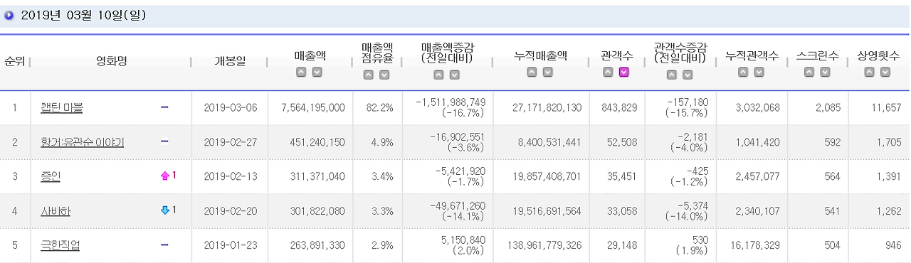 이번 주 박스오피스 분석은 여기까지입니다. 3월 20일 한국영화 기대작 <돈>, <우상>, <악질경찰>이 개봉하기 전까지는 <캡틴 마블>의 독주가 예상됩니다. 얼마나 더 많은 관객을 끌어모을지 예상해보는 것도 재미있을 것 같습니다.