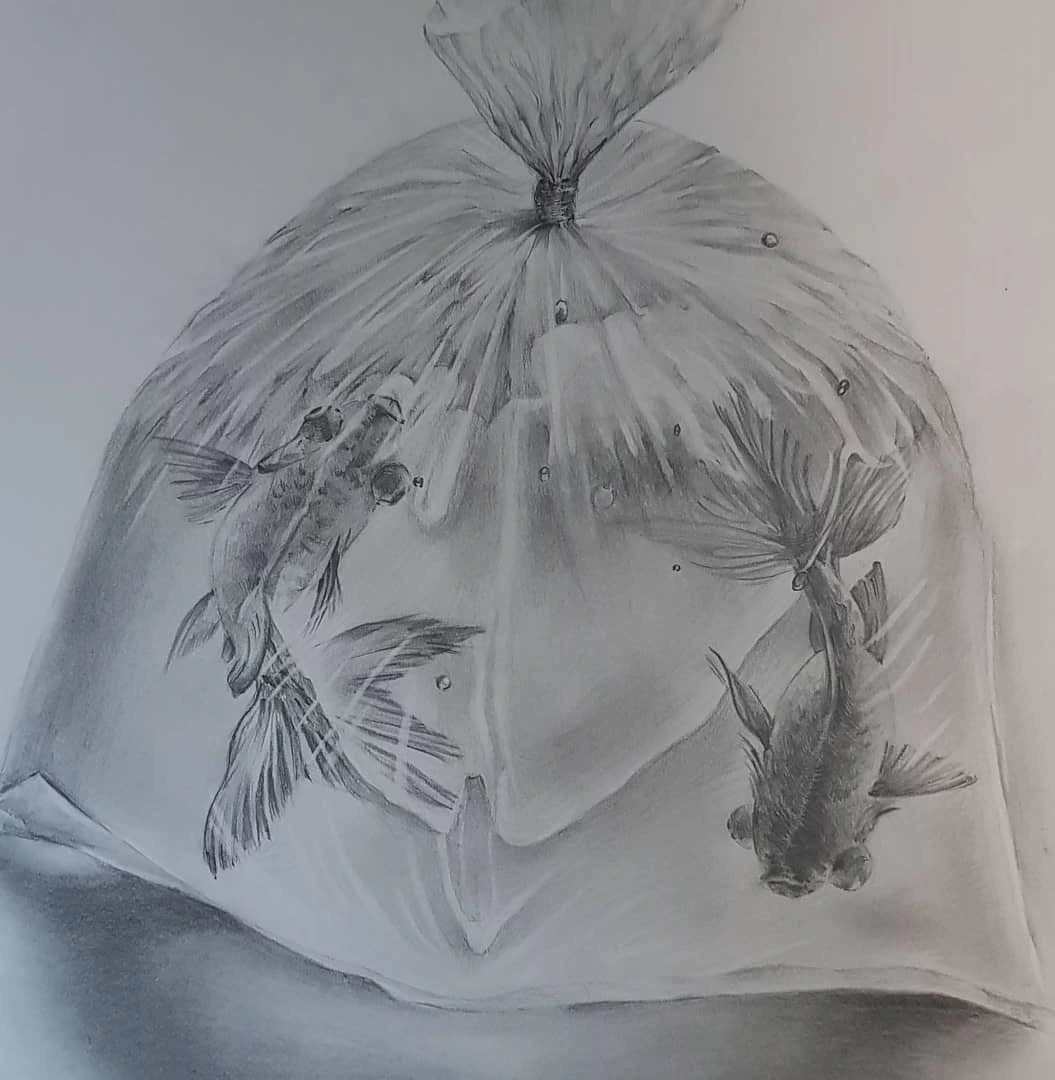헤엄치는 것인지 멈추어 있는 것인지 알 수 없는 금붕어는 봉지 밖의 아이와 함께 눈을 마주했다.