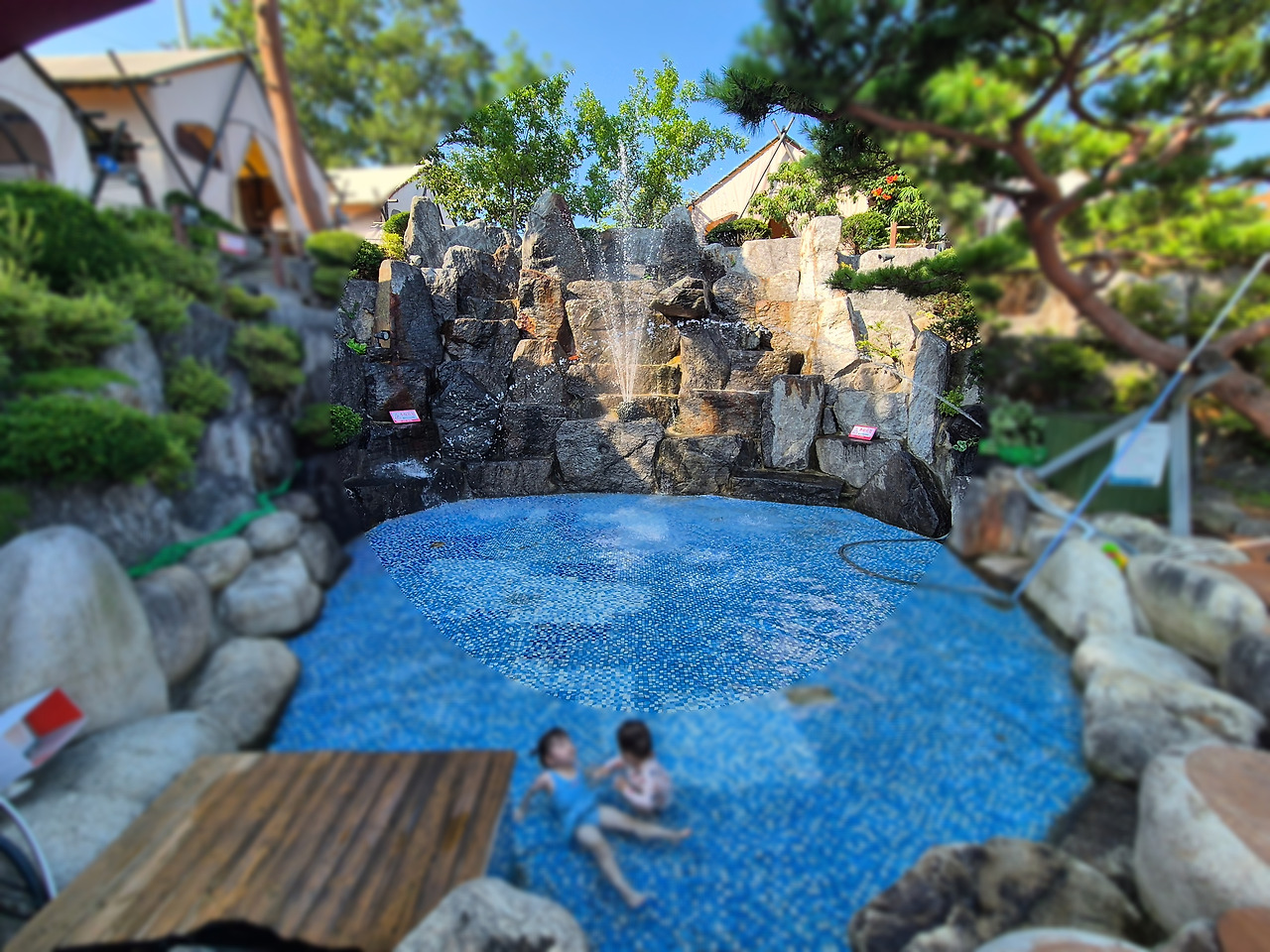 애초에 이 숙소를 선택한 이유는, 큰 수영장과 작은 연못이 함께 있기 때문이었다. 큰 수영장에서 꿀떡이가 튜브를 타고 수영을 하고, 작은 수영장에서 찰떡이가 물장구를 치는 아름다운 장면을 상상했던 것이다. 내가 간과한 것은 단 하나였다. 꿀떡이가 수심이 깊은 큰 수영장에 놀기 위해선 어른 한 명이 필요하고, 아직 어린 찰떡이가 돌로 둘러싸인 연못에서 놀기 위해선 또 다른 어른 한 명이 필요하다는 것.