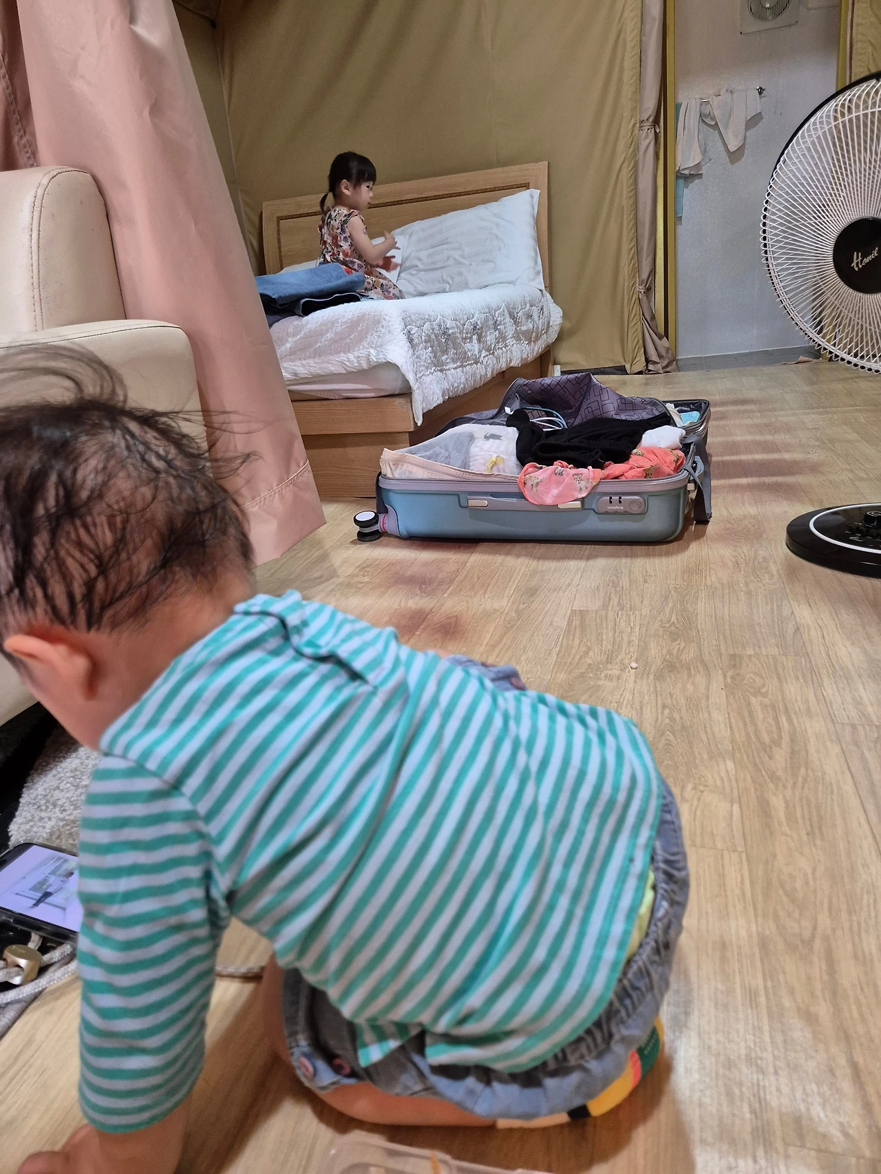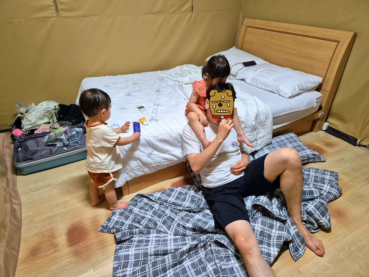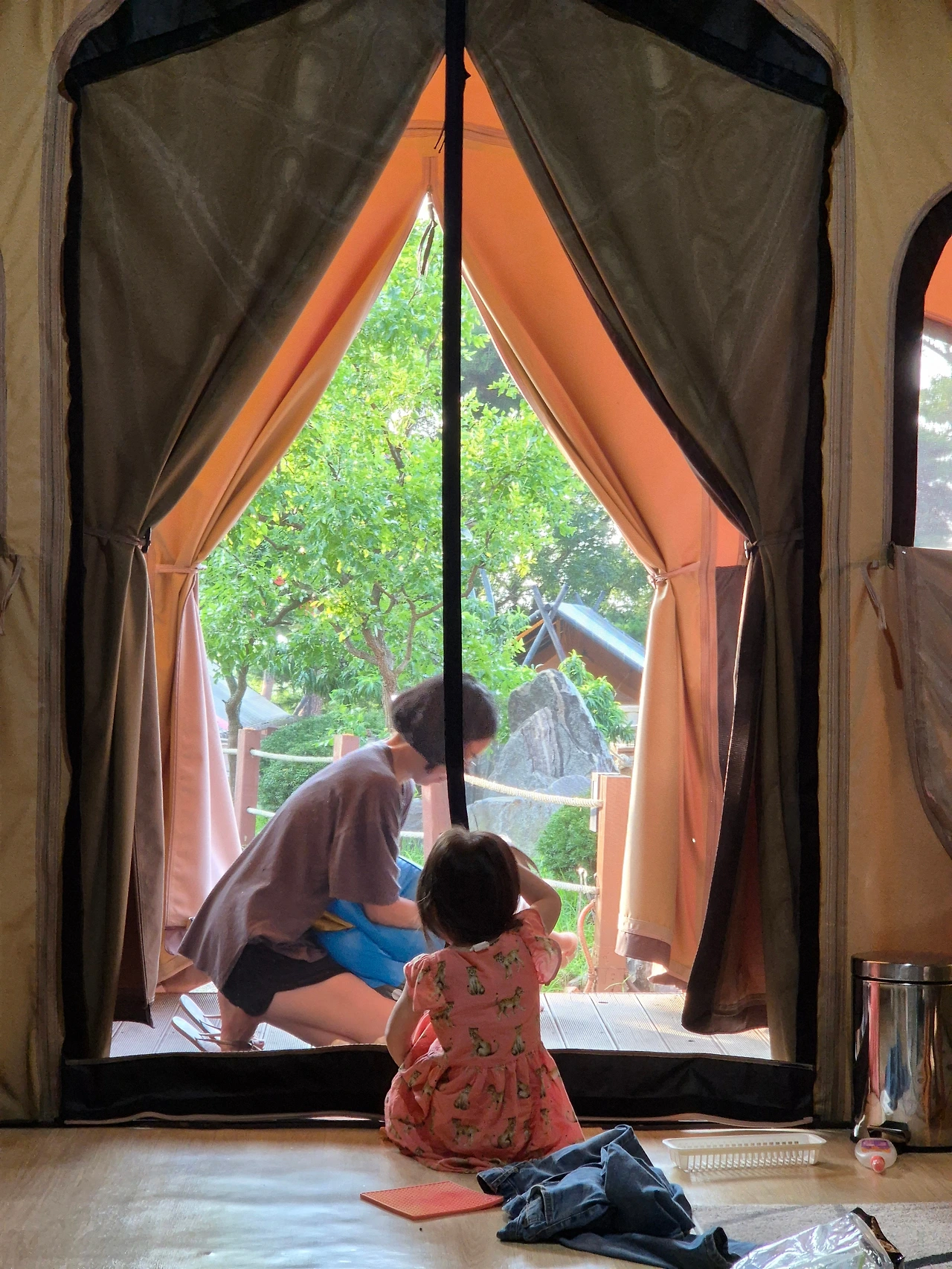 강화도 인근 해수욕장에 가는 차량들이 많았던 데다 1차선 도로 중간에 사고 차량까지 있어 김포에서 강화까지 무려 2시간이 걸렸다. 다행히 두 아이 모두 깊은 잠에 들었는데, 글램핑장에 주차를 하니 어떻게 알았는지 둘 다 슬며시 눈을 떴다. 눈을 뜬 첫째 꿀떡이는 눈앞에 펼쳐진 수영장을 보며 흥분을 감추지 못했고, 하필이면 우리 숙소(텐트)의 에어컨이 마침 고장나 둘째 찰떡이가 비 오듯 땀을 흘리기 시작했다.