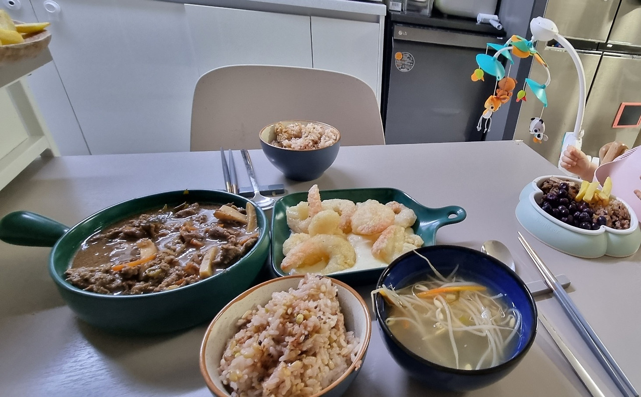 일단 한 명이 애를 봐야 한 명이 밥을 차릴 수 있다.