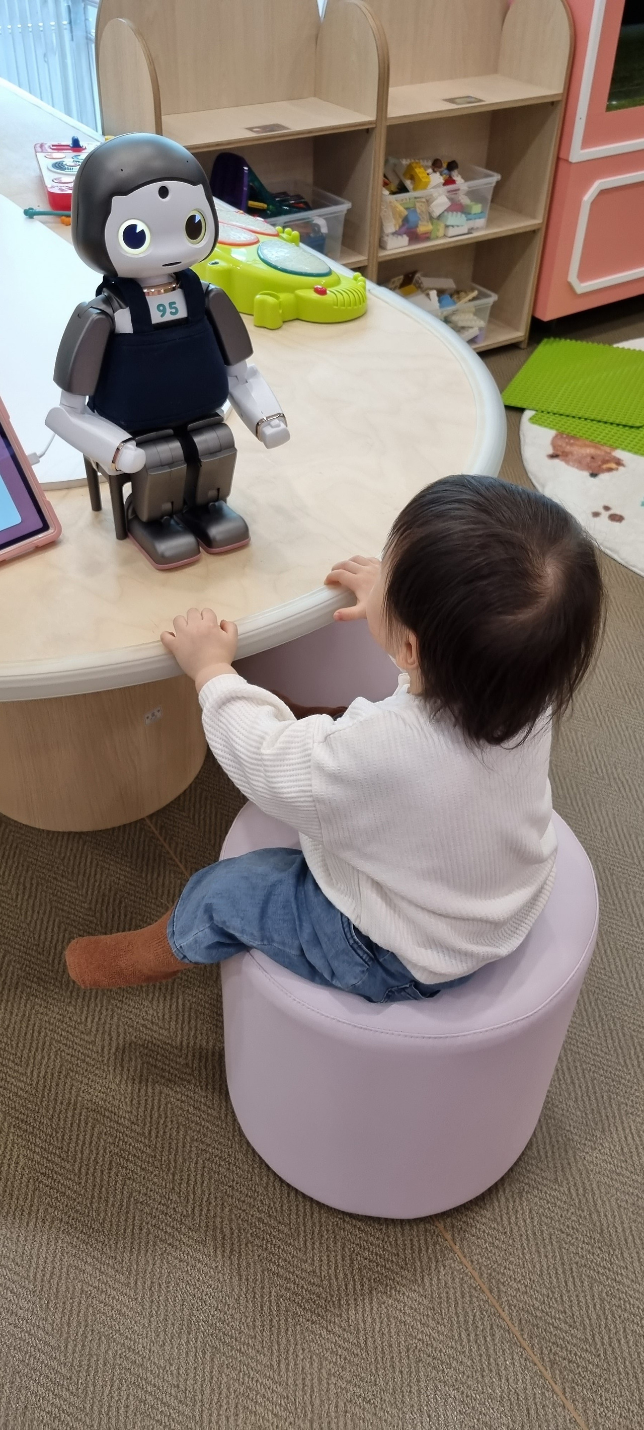 대화하는 AI로봇에게 말 거는 중 (로봇이 아직 아이 발음을 알아듣지 못해서 답답해하는 중)