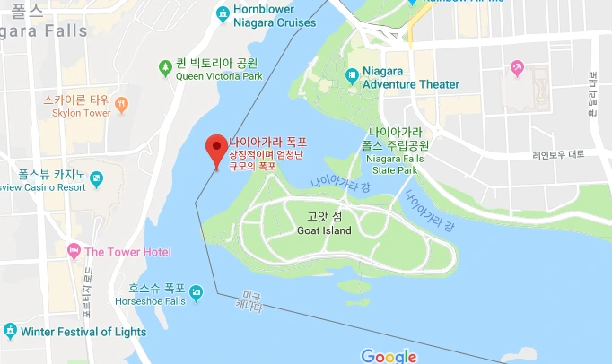 높이가 55미터에 폭은 671미터에 달하는 이 폭포는 고트 섬에 의해 두 부분으로 나뉘는데 동쪽은 아메리칸 폭포이며 왼쪽은 캐나다의 호스슈 폭포입니다. 제가 방문한 곳은 캐나다 쪽의 호스슈 폭포가 되겠습니다.