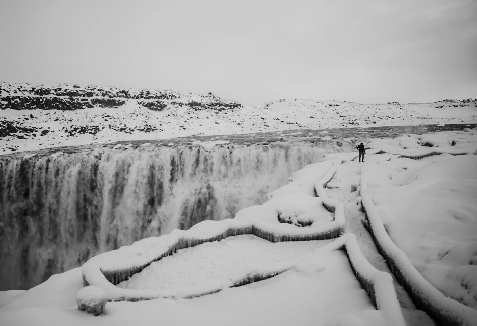 아이슬란드는 기상 상황에 따라 몇몇 스폿이 통제되기도 하는데 해당일자에 방문했을 때는 출입금지 표시가 되어있었습니다. 기회가 날마다 오는 게 아니라 용기를 갖고 통제선을 넘어가는데, 방문객이 없이 눈만 1미터 넘짓 쌓여있는 상태라 목숨에 경각을 느낄뻔한 오싹함을 몇 번 겪어 폭포를 둘러보는 데 성공했습니다. 아무도 없는 이곳에서 눈에 미끄러져 실종되면 여기서 누가 나를 찾을 수나 있을까라는 상상에 긴장과 함께 조심조심 발을 딛으며 사진을 찍게 된 하루였습니다.