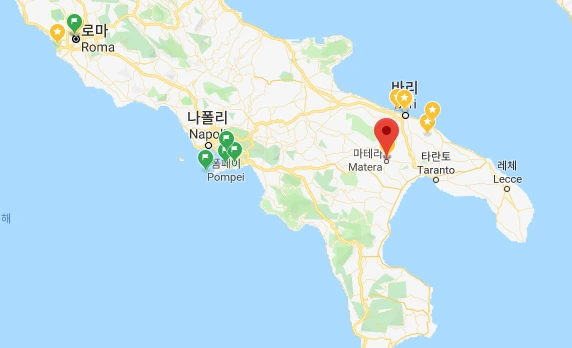마테라는 이탈리아 남부, 바실리카타 주 동부에 위치해 있는 곳으로. 인구 5만 6000명. 과수 재배 지대 상업의 중심지입니다. 이 부근에서는 선사 시대의 유물이 발견됐으며 13세기의 사원 · 성 · 고대박물관이 있습니다.