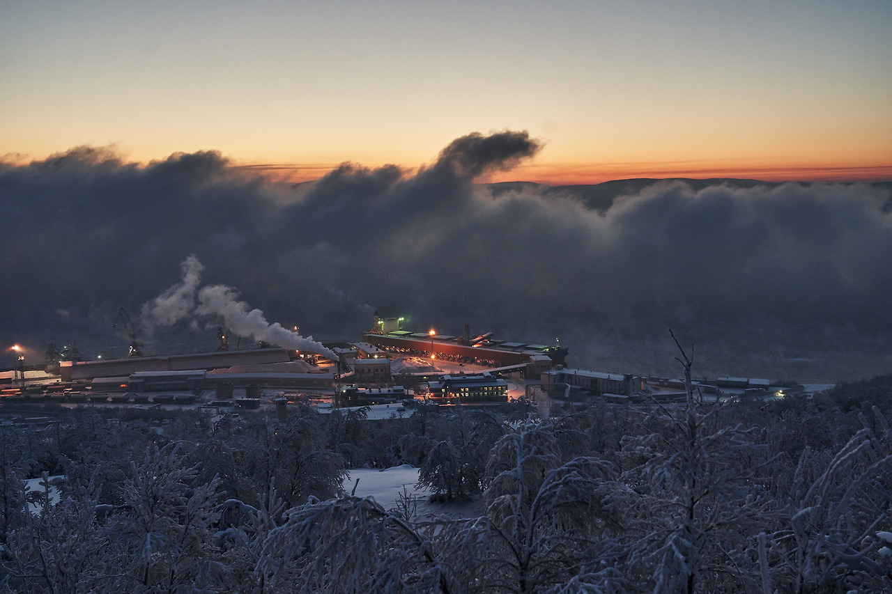 산업도시 무르만스크의 공장의 연기와 안개 사이로 비치는 햇살이 신비한 분위기를 자아냅니다. 무지개까지 형성되는 이곳의 사진은 아지무트 호텔 무르만스크라는 곳에서 본 아침 7시의 경관입니다.