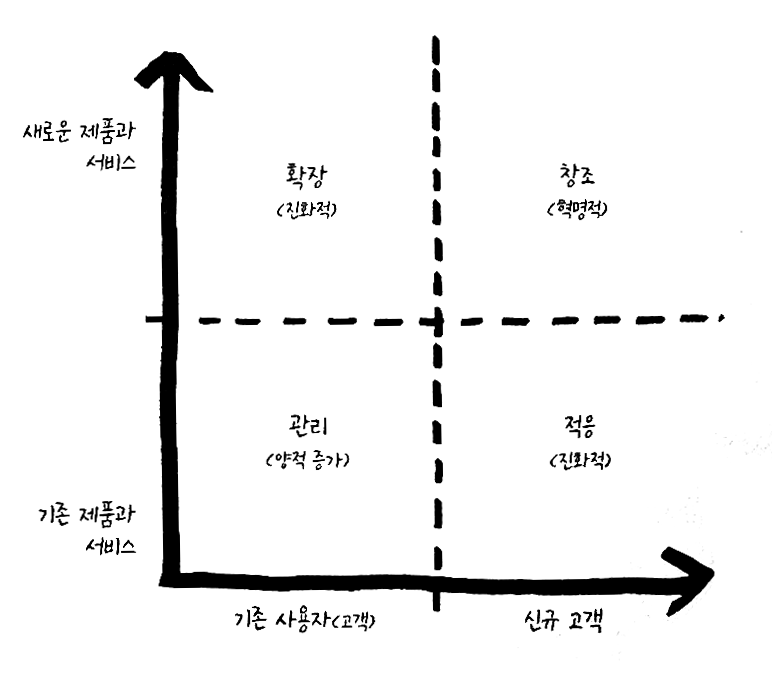 임 시장에 나와있는 제품(또는 서비스)에서부터 새로운 제품을 나타네는 세로축, 그리고 기존 고객과 신규 고객을 나타내는 가로축을 따라 혁신의 현주소를