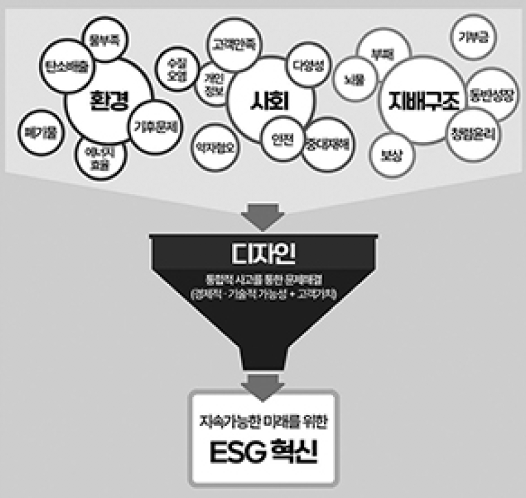 기업에서 환경적, 사회적 기여를 위한 SDGs 프레임워크는 ESG 프레임워크와 유사한 양상을 보인다. 디자인을 활용한 경험과 참여의 개념은 전략적으로 같은 개념이라고 할 수 있다. 경제적·환경적·사회적 관점에서 디자인은 혁신을 위한 도구로써 중요하게 사용되며, 지속가능 디자인의 실천 가능성은 미래 디자인의 중요한 가치로 여겨진다.
