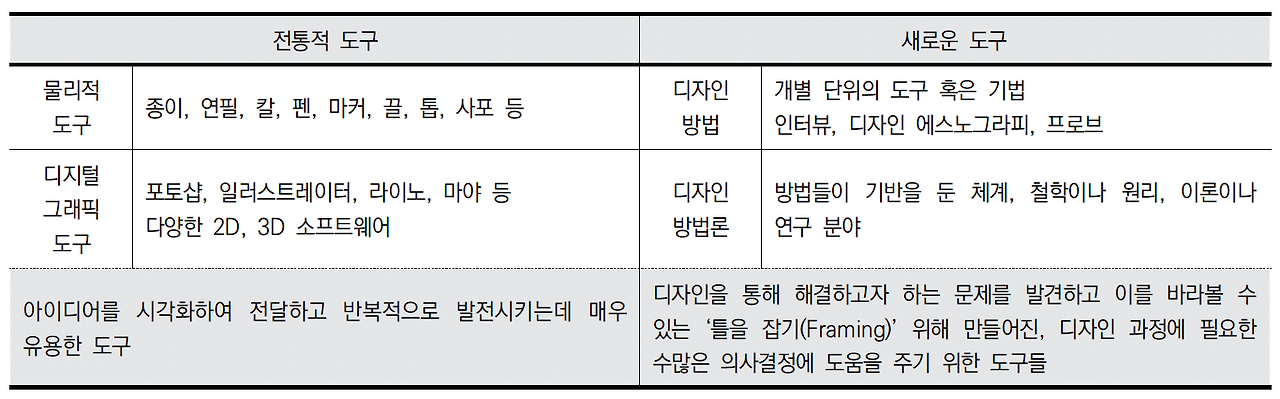 디자인을 통해 해결하고자 하는 문제를 발견하고, 이를 바라볼 수 있는 ‘틀을 잡기(Framing)’ 위해서는 새로운 도구를 잘 활용하는 것이 중요하다. 유형의 디자인을 유지하되, 무형의 서비스 디자인으로 가치와 패러다임이 변하는 것처럼 도구의 변화도 중요하게 여겨진다. 산업화 사회에서 소비, 생산되는 제조방식을 먼저 생각한다면 전통적 도구를 사용하는 것이 맞지만, 지식디자인 사회에서 인간 중심 시스템의 서비스와 행동 유도를 위한 디자인은 새로운 도구를 사용해 다양한 방법을 시도할 필요가 있다.