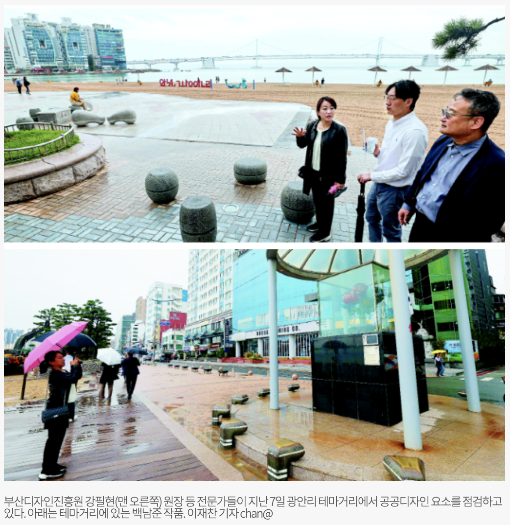 부산시와 수영구, 부산관광공사가 설치한 안내 표지판도 중구난방으로 들어서 있었다. 크로스컬러디자인연구소 박영심 소장은 “해운대해수욕장에 설치된 세계적인 설치미술 작품이 관리 부실에 주변 분위기와 어울리지 않는다는 시민 민원으로 철거된 사례를 반면교사 삼아야 한다”며 “광안리해변을 브랜딩 할 수 있는 특화된 공공디자인과 가이드라인을 정립해야 하고, 민관이 함께 지속적인 관리 체계를 만들어야 한다”라고 말했다.