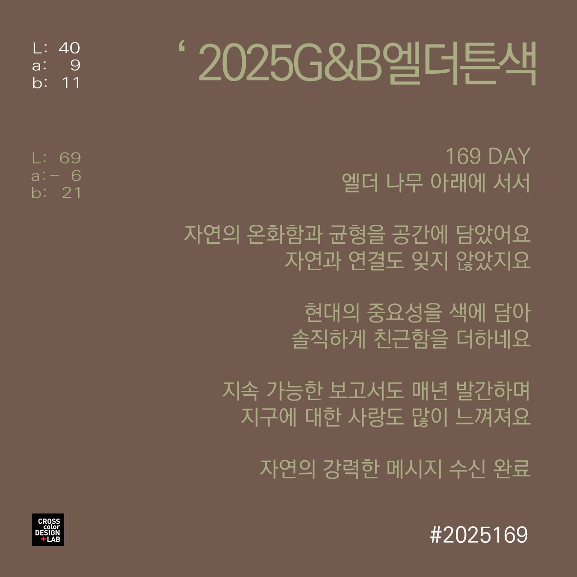 컬러카드는 배경색에 메인컬러인 Elderton을 표현했고, 글자는 푸른 잎의 밝은 녹색으로 표현하여 부드러운 나무 아래에 있는 듯한 웅장하고 따뜻한 느낌으로 전해집니다.