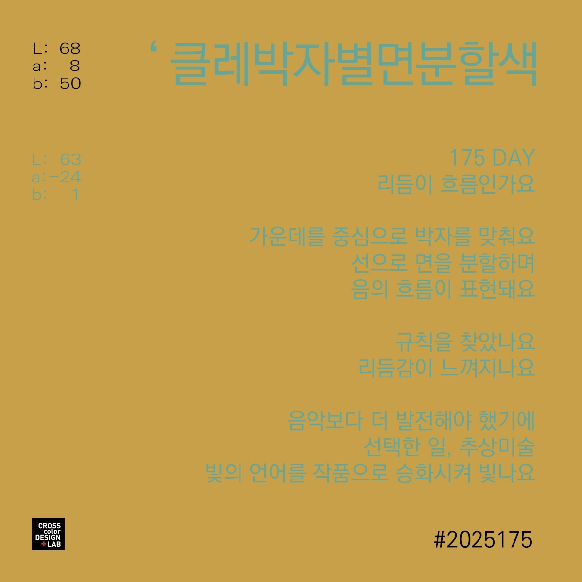 컬러카드는 이 작품에서 시작하였습니다. 제일 많이 보이는 땅의 컬러를 추출하여 배경으로 하였고 중심에서 빠질 수 없는 오아시스 같은 물의 컬러를 규칙으로 글에 표현하였습니다. 너무 많은 파울클레의 작품은 화려한 멀티컬러들의 색과 선들을 주로 사용하였고, 면을 분할한 작품들이 특징이라서 파울클레의 색상에 대해 조심스럽지만 자연을 모티브로 하고 인간의 정신적 경험을 바탕으로 현실을 넘어서 보이지 않는 것을 드러내는 도구였습니다. 4천 점이 넘는 작품의 색을 통계내기는 힘들고 음악을 듣고 리듬과 박자를 면분할로 표현한 작품을 대표작품으로 삼아 컬러를 추출하였습니다. 분명 클레의 활동이 너무 광범위하기 때문에 이 컬러카드로 클레를 판단하거나 확정 지을 수 없다는 것을 다시 한번 더 말씀드립니다.