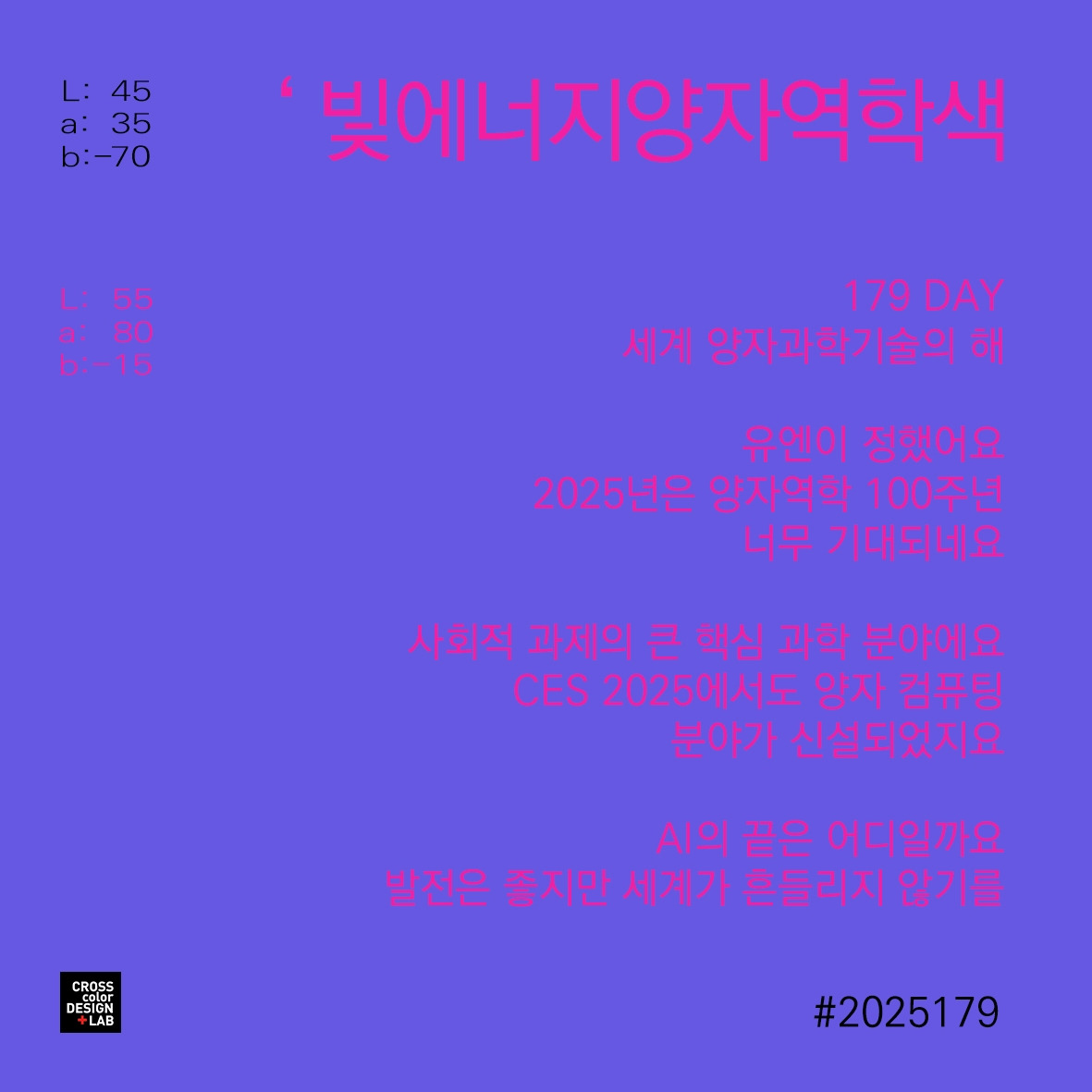 열정과 도전정신이 합쳐진 '보라색이 가장 적합할 것이다'라고 가설을 세워봅니다. 보라색은 신비롭고 불확실한 성질을 지닌 색으로, 양자역학의 확률적 본질과 불확정성 원리를 상징할 수 있습니다. 또한, 양자역학의 주요 개념 중 하나인 '양자 얽힘'은 보라색이 지닌 혼합적이고 조화로운 특성과 잘 어울립니다. 컬러카드의 글자에 표현한 '마젠타'는 매우 귀한 색입니다. 다른 색들을 섞어 만들어지지 않는 색이 있지요. 프린트할 때, CMYK의 잉크 중에서도 M에 해당됩니다.