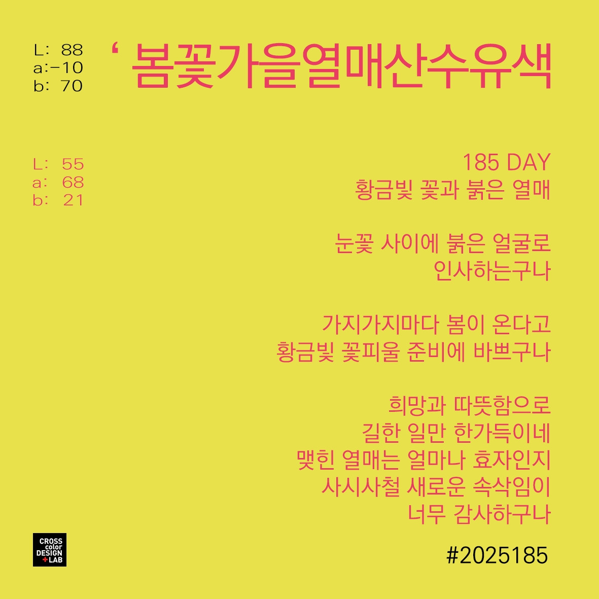 가을이 오면 산수유의 색은 완전히 달라집니다. 꽃이 지고 난 자리에 둥글고 붉은 열매가 맺히지요. 이 열매는 녹색이었다가 깊은 붉은빛을 띠게 되지요. 열매의 붉은색은 성숙과 결실을 의미하며, 따뜻한 가을 분위기와 잘 어우러집니다. 전통적으로 붉은색은 길상과 장수를 뜻하는 색입니다. 산수유 열매 역시 한약재로 사용됩니다. 건강을 기원하는 의미를 담고 있지요. 꼭 성냥의 붉은 머리 같네요. 불을 붙일 수 있는 실마리로 열정이 가해졌을 때 언제든지 불이 붙을 수 있는 아이디어 같은 것처럼 말이죠.