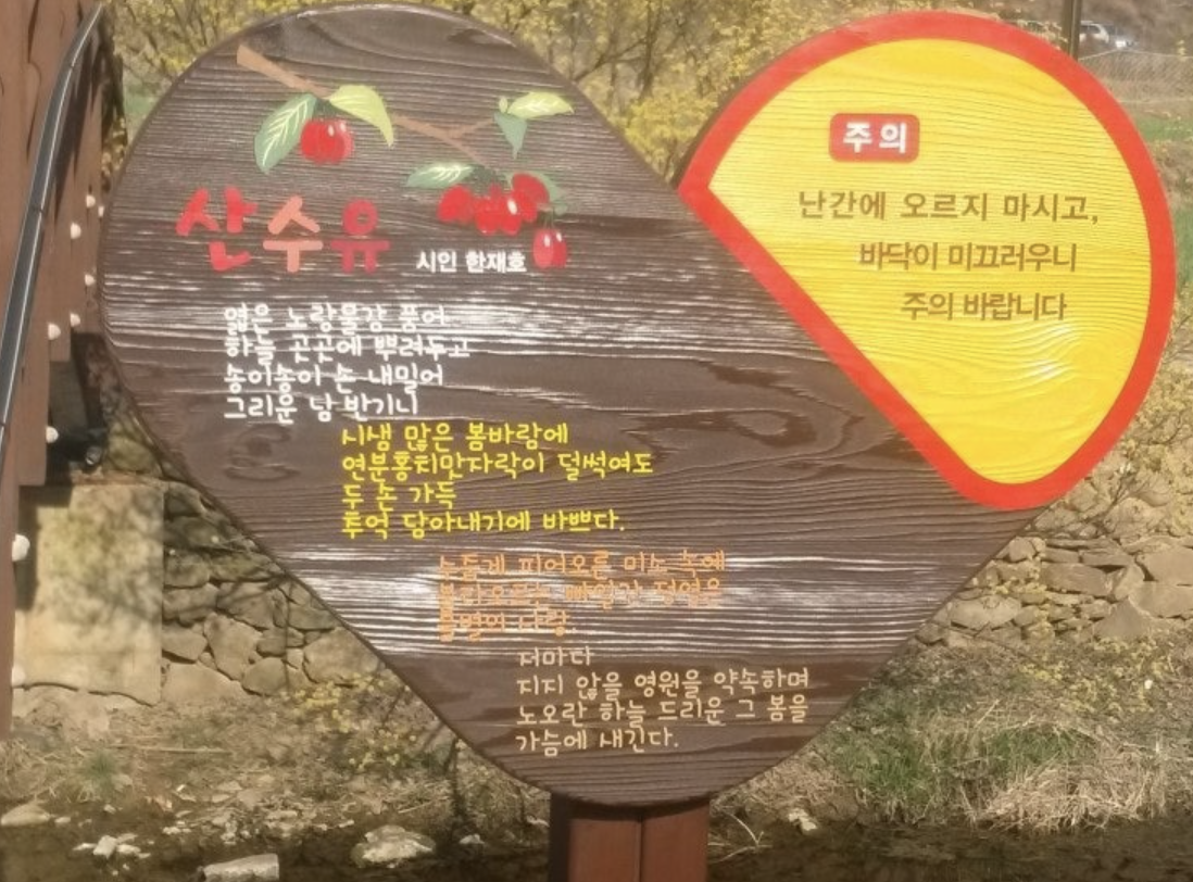 아.. 하트모양 나무 깎느라 힘드셨을 텐데.... 저렇게 멋진 시 옆에 "주의" 문구는 어느 분이 최종 오케이를 했겠지요... 너무 속상해서 첨부해 봅니다. 저렇게 해야 너무 신기해서 사람들이 보고 조심하겠지요..ㅠㅠ 산의 경관을 해치지 말아야 하는데 어떤 것이 최선인지.... 산수유 공부하며 기분이 좋았는데 갑자기 마음이 어두워지고 있습니다...