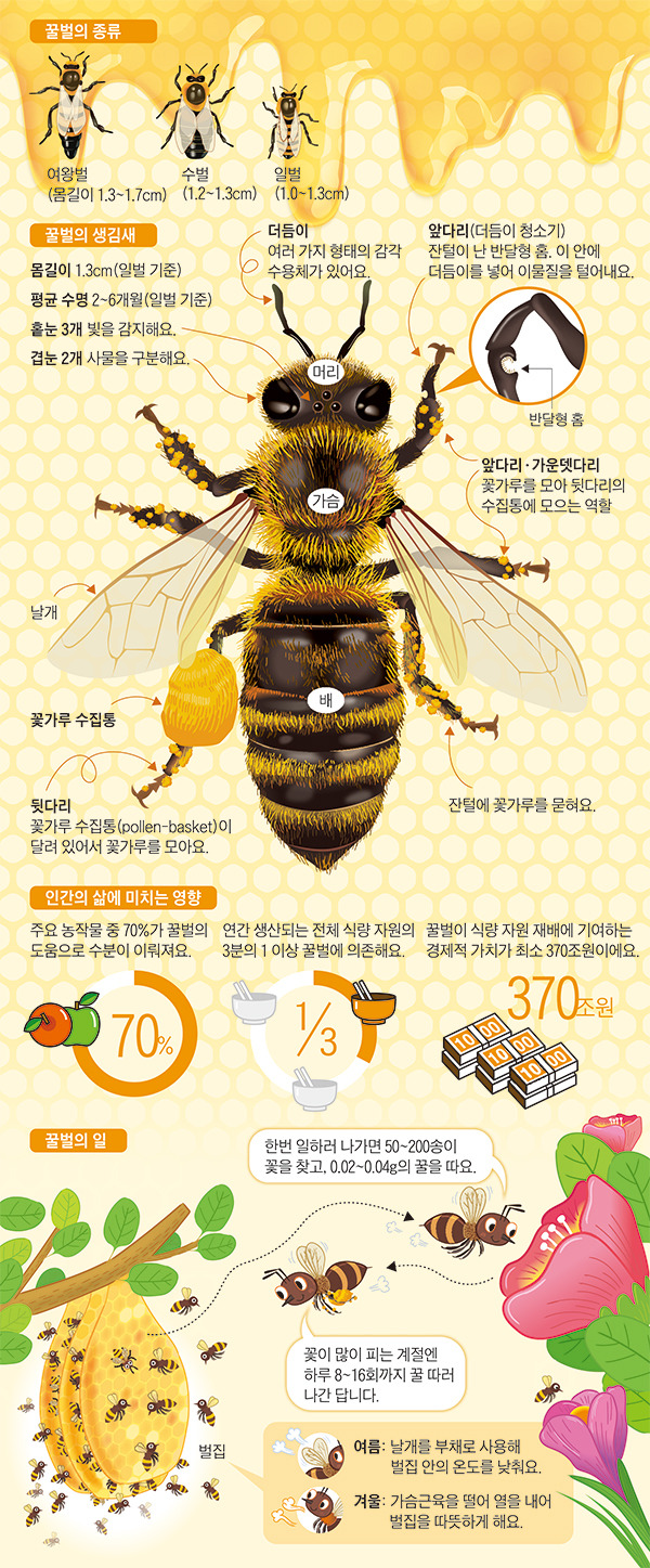 달콤하고 몸에 좋은 꿀, 그 꿀을 한 통을 가득 채우려면 꿀벌은 얼마나 일을 해야 할까요? 1kg의 꿀을 생산하기 위해 꿀벌은 560만 송이의 꽃을 방문하고 7만 번을 이동합니다. 꿀벌 한 마리가 하루에 채취하는 꽃꿀의 양은 50mg으로, 자신의 체중과 거의 같습니다. 꿀은 원래 꿀벌의 먹이입니다. 인간이 꿀을 빼앗아 가면 꿀벌은 부족한 꿀을 채우기 위해 더 많은 노동을 해야 합니다. 이는 꿀벌의 수명을 단축시키는 주요 원인이라고 하지요. 지금 인간의 저출산 위기도 꿀벌이 사라지는 것과 비례한다고 생각합니다.