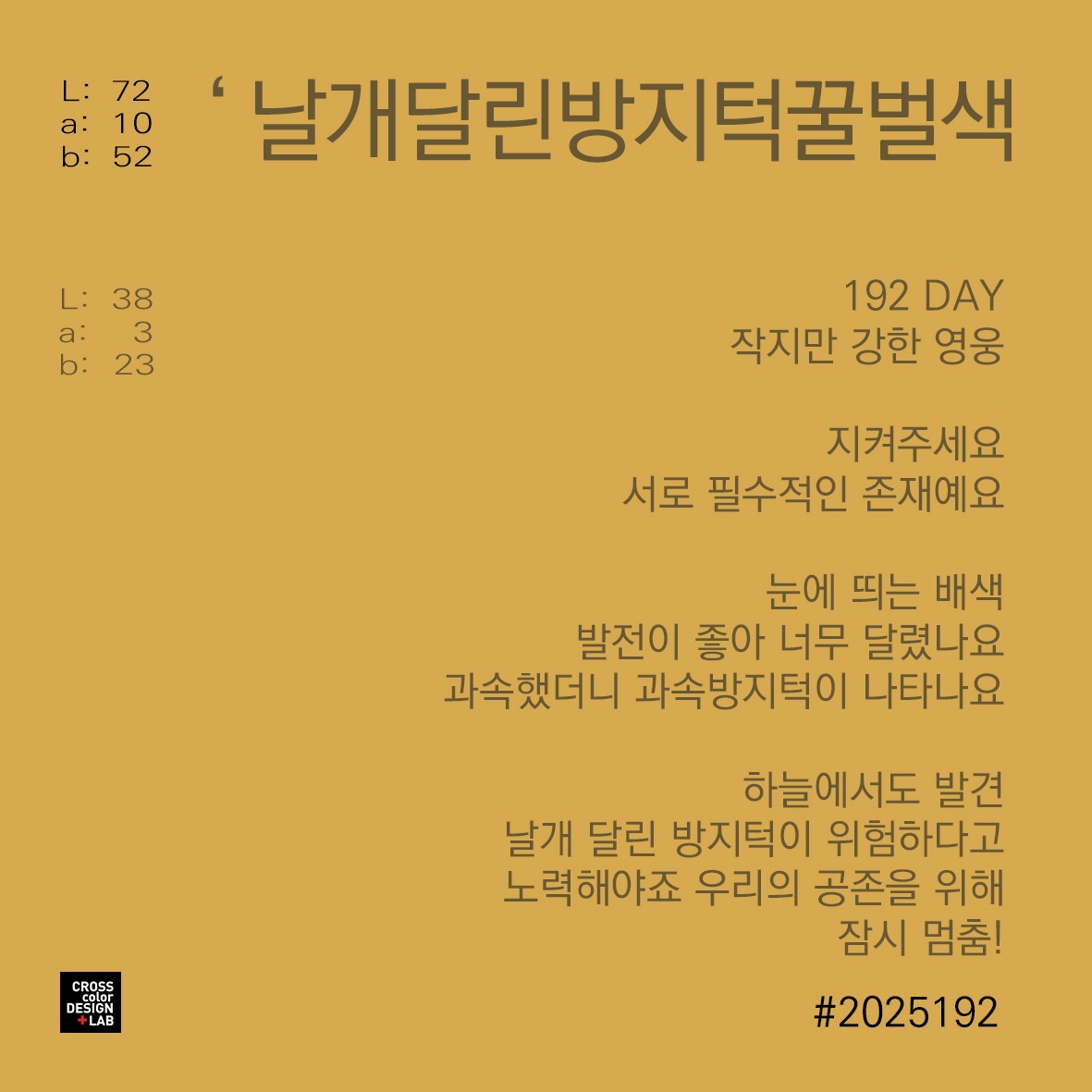 배색 중에서 제일 가독성(눈에 잘 띄는)이 높은 색은 노란색과 검은색입니다. 도로 위 안전지킴이 '방지턱'의 배색이 노랑과 검정으로 되어 눈에 띄게 만든 이유이기도 하지요. 저는 꿀벌을 보며 방지턱을 떠올렸습니다. 꼭 우리 사회에게 '경고'의 메시지를 주는 것 같기도 합니다.