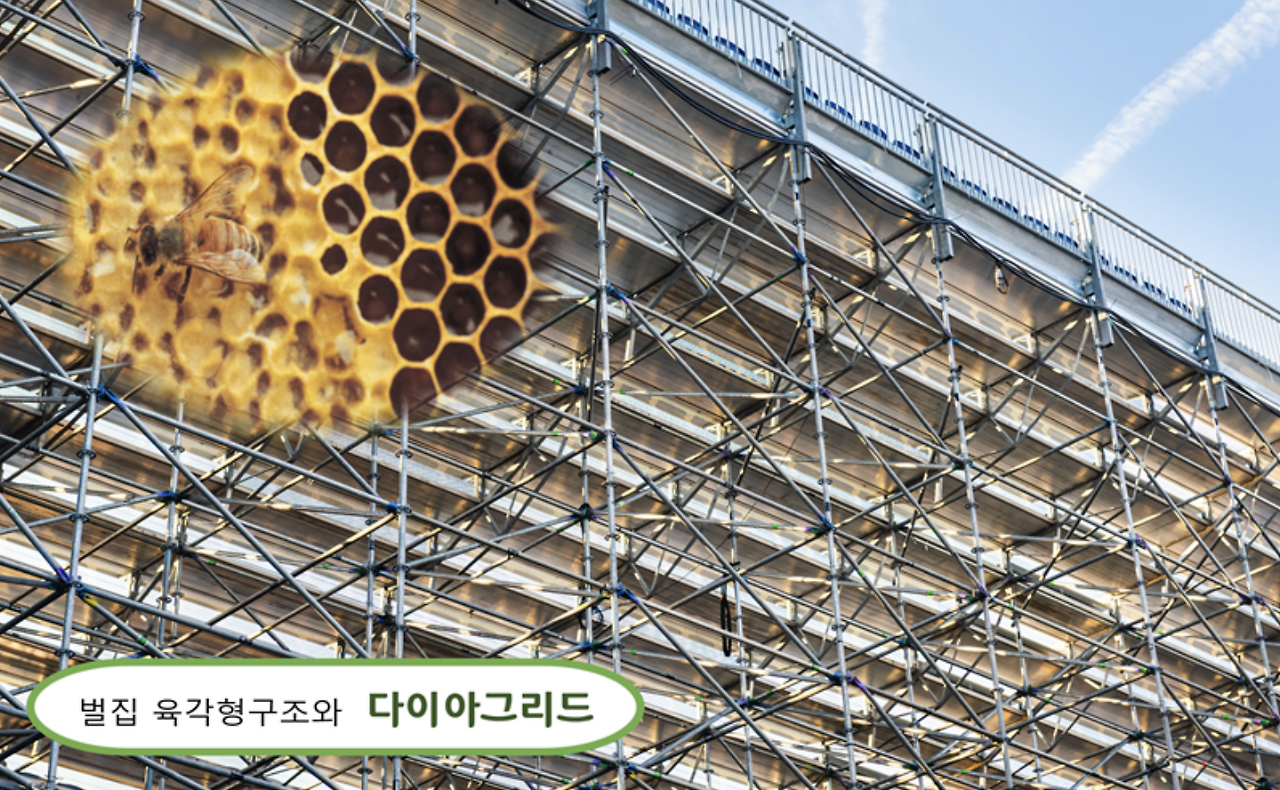 다이아그리드란? 대각선(Diagonal)과 격자(Grid)의 합성어로 대각 가새를 반복적으로 사용한 형태의 구조를 말하는데요. 다이아그리드의 뼈대는 기둥과 가새의 역할을 동시에 수행해 건물이 받는 하중을 효과적으로 저항해 낼 수 있습니다.
