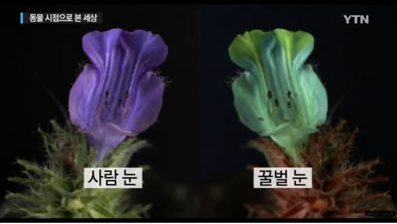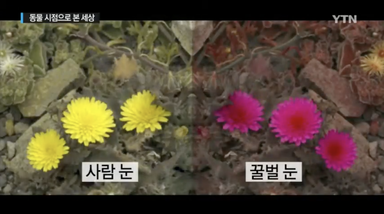 노란색 민들레는 꿀벌에게는 붉은색으로 보입니다. 보라색 꽃인데 꿀벌은 초록색으로 보입니다. 사람이 감지하지 못하는 빛까지 감지해서 어떤 꽃에 꿀이 많은지 보는 것이지요.