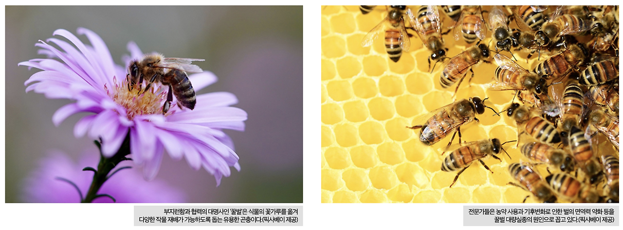 꿀벌은 다양한 꽃에서 꿀과 꽃가루를 채집하며, 자연의 다채로운 색깔을 몸에 담습니다. 꿀벌이 옮기는 꽃가루는 식물의 유전자를 섞어 새로운 품종을 만들어내고, 이는 자연의 다양성을 풍부하게 합니다. 꿀벌이 없다면 우리는 지금처럼 아름다운 꽃과 다양한 과일을 즐길 수 없을 것입니다.