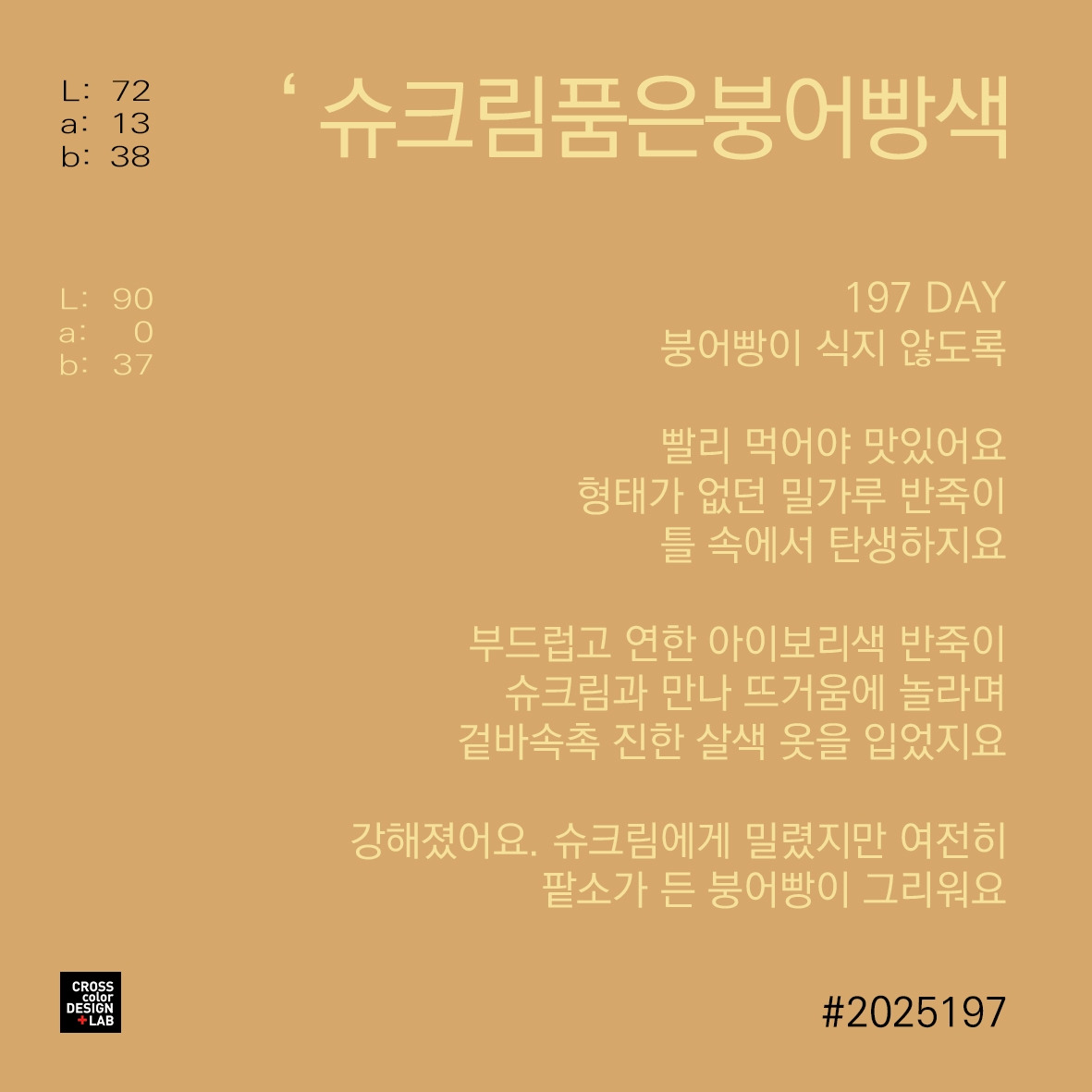 겨울의 끝자락을 알리고 있었지요, 이미 봄이 온 것이 샘나서 꼬장을 부리는 것 같기도 했어요. 찬 바람 속에서 김이 모락모락 피어오르는 붕어빵을 손에 쥐면, 그 온기가 손끝에서 퍼져나가듯 마음도 서서히 녹아내리지요. 바삭하게 구워진 붕어빵의 표면은 노릇한 갈색으로 '빛난다'는 표현이 맞을 것 같아요, 그 속에는 따뜻한 팥과 부드러운 슈크림이 자리 잡고 있습니다. 뒤늦은 후발주자이지만 인기가 많은 슈크림색을 오늘 컬러카드에 배색했습니다. 겨울의 냉기와 붕어빵의 따뜻한 색감이 대비를 이루는 이 순간, 계절이 바뀌어가는 경계에서 더욱 선명해짐을 느끼며 붕어를 잡은 오늘이네요.