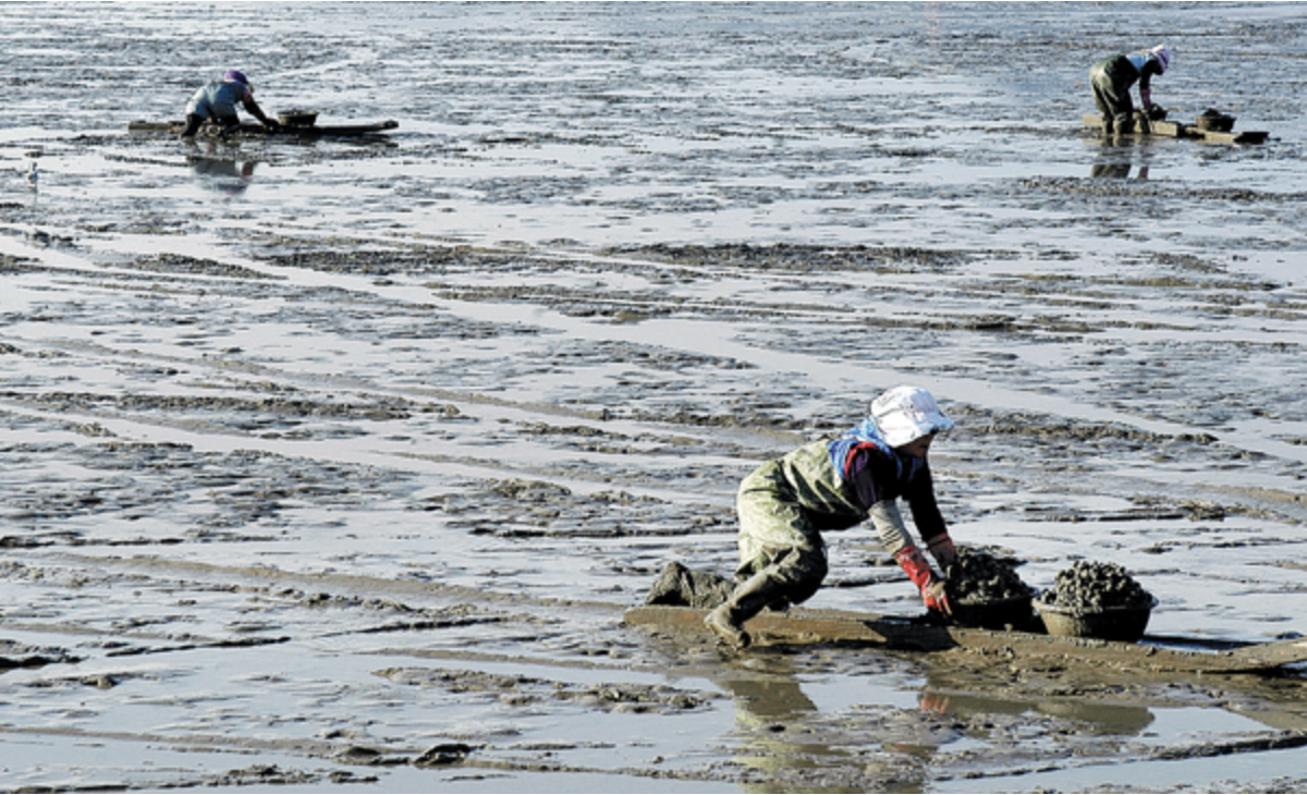 다리에 쥐가 납니다. 일어날까.. 생각하고 있는데 몸은 움직이지 않고, 장갑을 두 개나 끼고 둔한 손놀림에 무언가 묵직한 것이 잡힙니다. 오~ 유레카! 조개입니다. 아이코! 조개인 줄 알았더니 진흙덩어리네요. 눈물을 참으며 쥐가 난 다리를 어찌할 방법을 모릅니다. 침을 묻혀 코에 바를 수도 없는 상황입니다. 쥐 나는 다리가 마비가 되어 못 걸으면 어쩌나... 이 뻘에 영원히 갇히면 어쩌나 불안 불안합니다. 그렇게 견디며 빨간 바구니를 조금씩 채워갑니다. 파내도 파내도 뻘 속에 조개들은 어찌나 도망을 잘 가는지요.