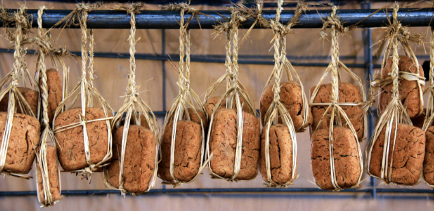 충분히 발효된 메주는 바람이 잘 드는 곳에서 건조되면서 수분이 빠지고 색이 더욱 짙어집니다. 처음에는 황갈색이었던 표면이 점차 짙은 갈색으로 변화하고, 일부는 검붉은 색조까지 띠기도 합니다. 이는 메주 안에서 단백질과 탄수화물이 분해되면서 색이 점점 더 깊어지는 과정입니다.