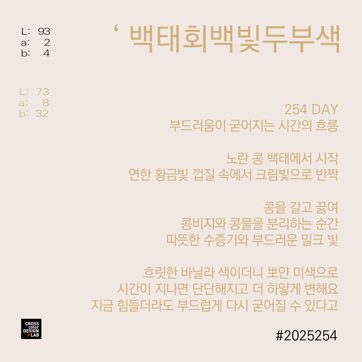 처음 마주하는 백태는 연한 황금빛 껍질 속에 윤기를 머금고 있으며, 물에 불리면 색이 부드러운 연노랑으로 바뀝니다. 밤사이 물속에서 점차 통통하게 불어난 콩은 햇빛 아래서 은은한 크림색으로 반짝이며, 그 자체로 생명을 품은 듯한 색을 드러냅니다.
