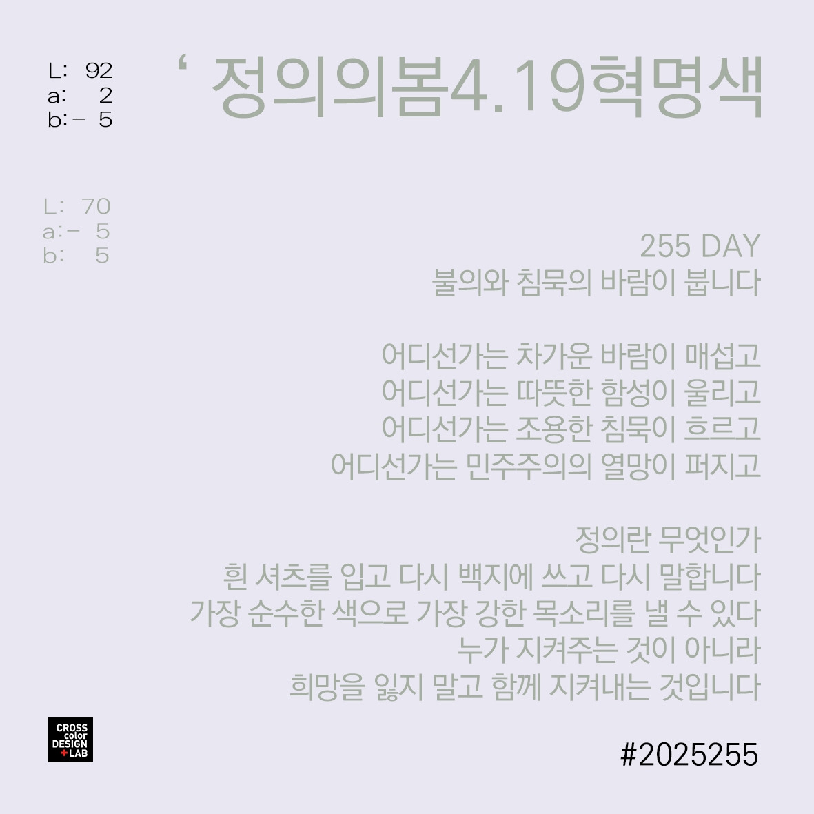 컬러카드에도 흰색을 표현하고 싶었지만 색조를 whitish로 표현하고, 태극기의 붉음과 푸름을 섞어 연보랏빛으로 흰색을 연출해 보았습니다. 글자는 녹색빛이 도는 회색으로 정의의 새싹이 돋아남을 뜻했습니다. 흰색 교복이 붉게 물들었지만 지워지지 않는 상처로 많은 사상자가 나왔었던 아직도 밝은 빛으로 빛나는 희망찬 우리들의 모습을 표현하고 싶었습니다.