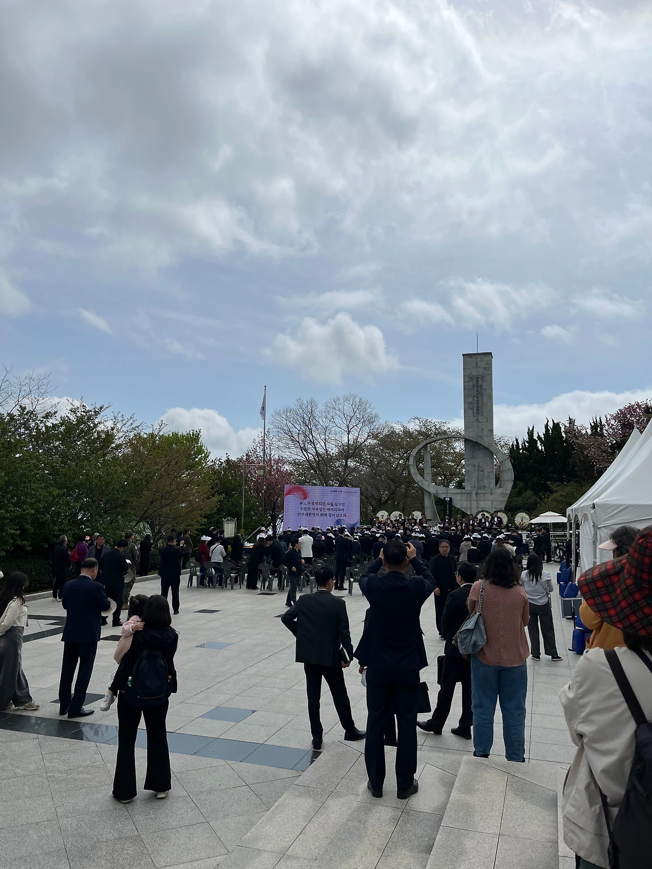 그러나 그 아름다운 풍경 뒤에는 4.19 혁명을 기념하는 엄숙한 행사가 자리하고 있었습니다. 순간, 그저 봄을 즐기던 제 자신이 조금은 부끄럽게 느껴졌습니다. 이유는 다름 아닌, 4.19 혁명을 기념하는 행사 때문이었습니다. 이 작은 혼잡 속에서도 우리는 과거를 기억하고, 그날의 함성을 되새기는 시간을 가졌습니다.
