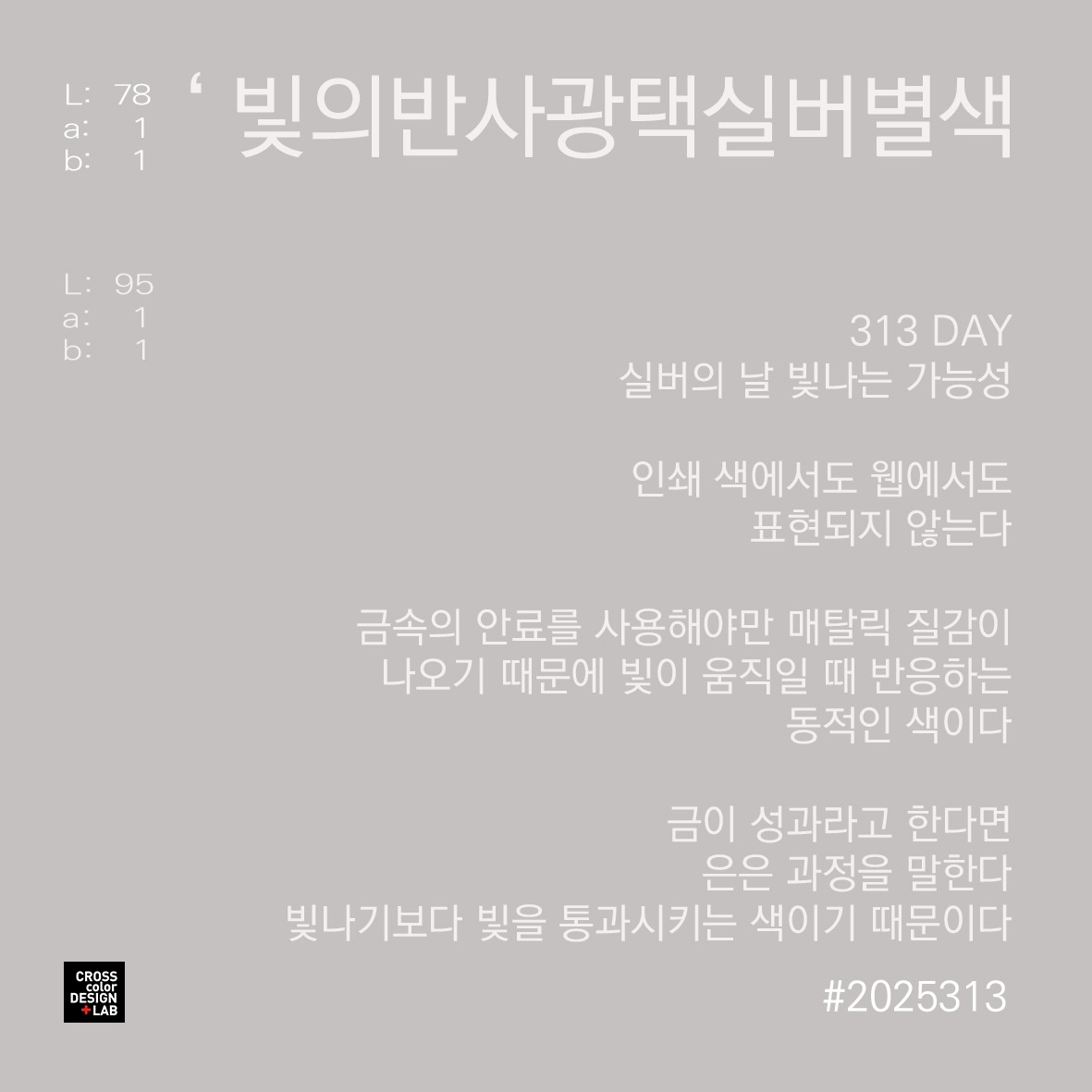 왜냐하면 실버의 본질은 ‘색’이 아니라 ‘광택(reflective surface)’이기 때문이다.