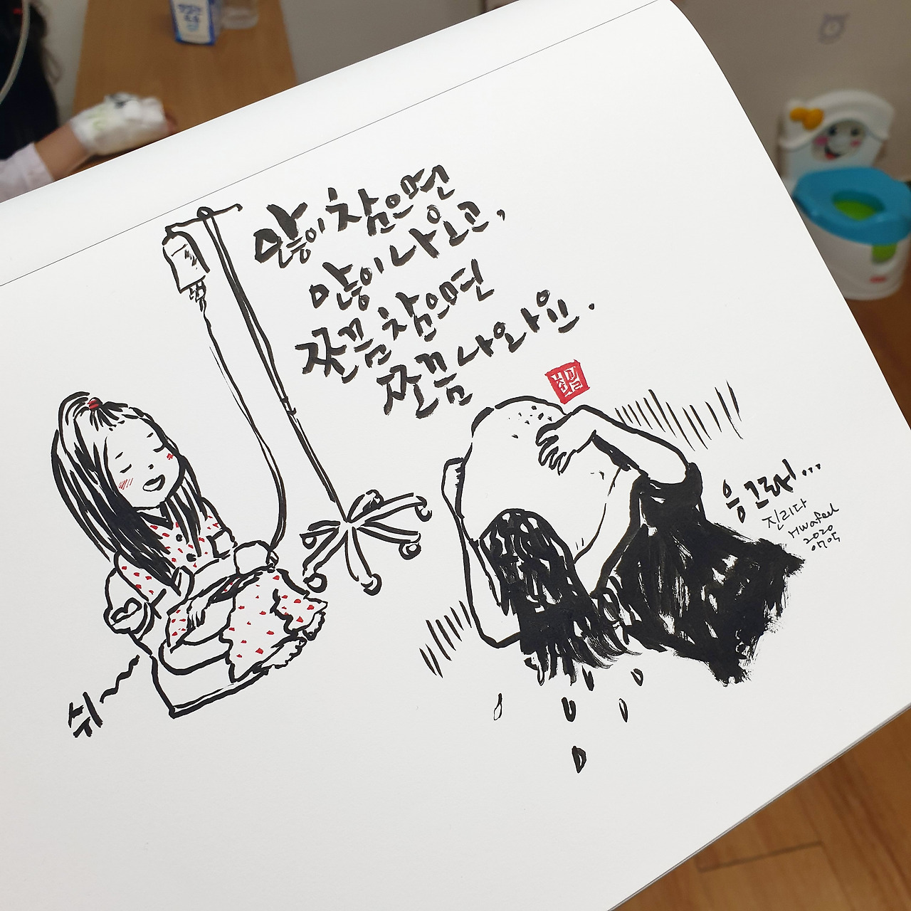 새벽 한 시 십분. 낯선 공간이 주는 이질감에 쉽사리 잠이 들기가 힘들다. 이 공기에서 어떤 숨을 쉬어야 시원스레 쉬는 숨인지 참으로 어려운 지경이다. 어차피 일어난 일에 대한 순응은 빠른 편이지만, 낯선 곳에 대한 적응은 너무도 무디고 어렵다. 아이가 아픈 상황에 당황해한다거나, 살갗에 꽂히는 바늘을 보고 있음이 무섭다거나 하는 건 없는데, 푸르뎅뎅 벽지에 작은 얼룩이 신경 쓰이고, 시트나 베개에 수건을 깔지 않고서는 도저히 잠을 이룰 수가 없다.