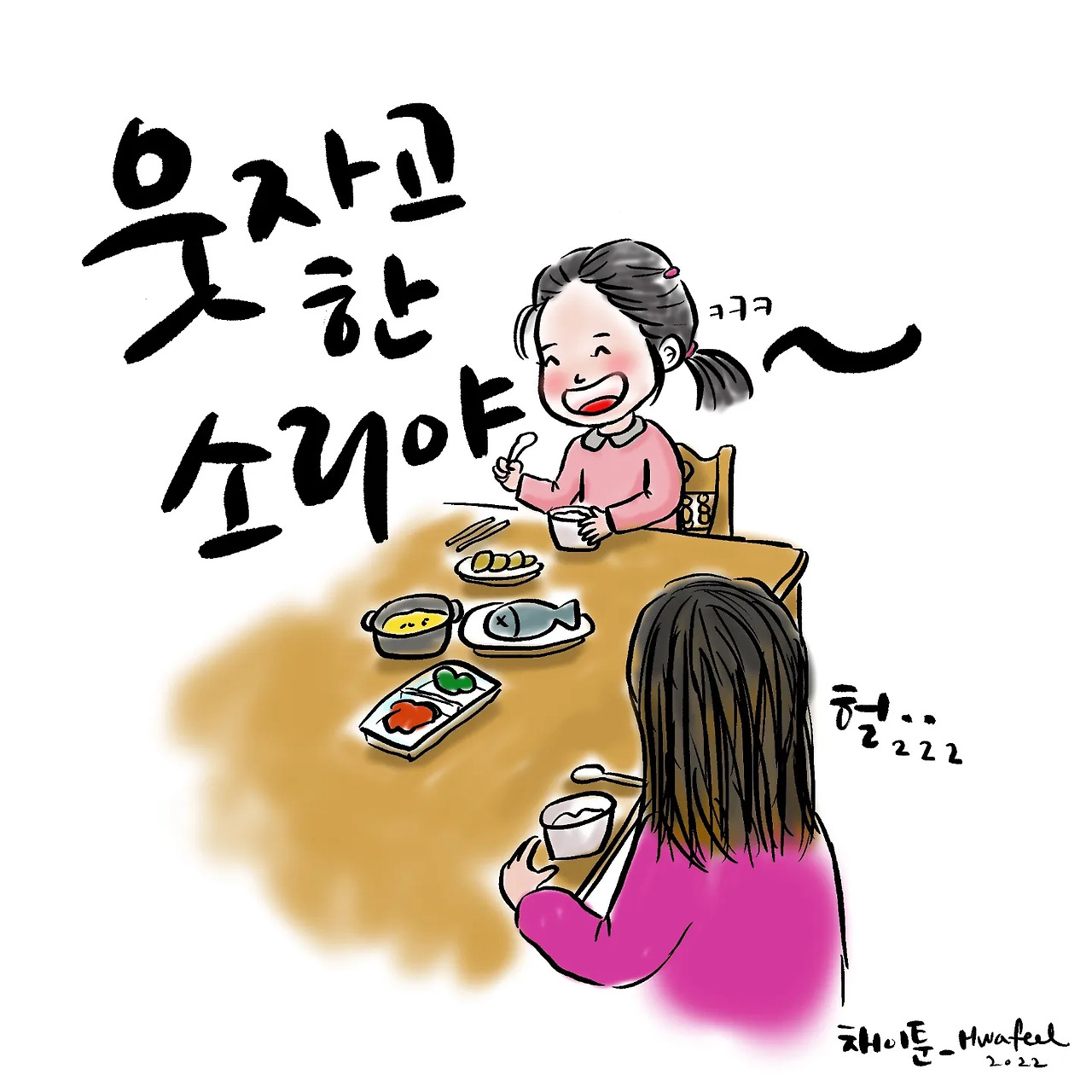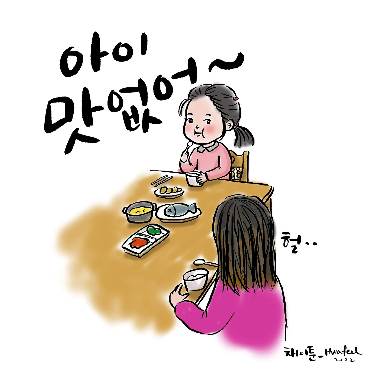신나게 토끼 인형과 랩을 하던 채이가 밥상 앞에 앉아서 한 술을 뜨며 하는 말.