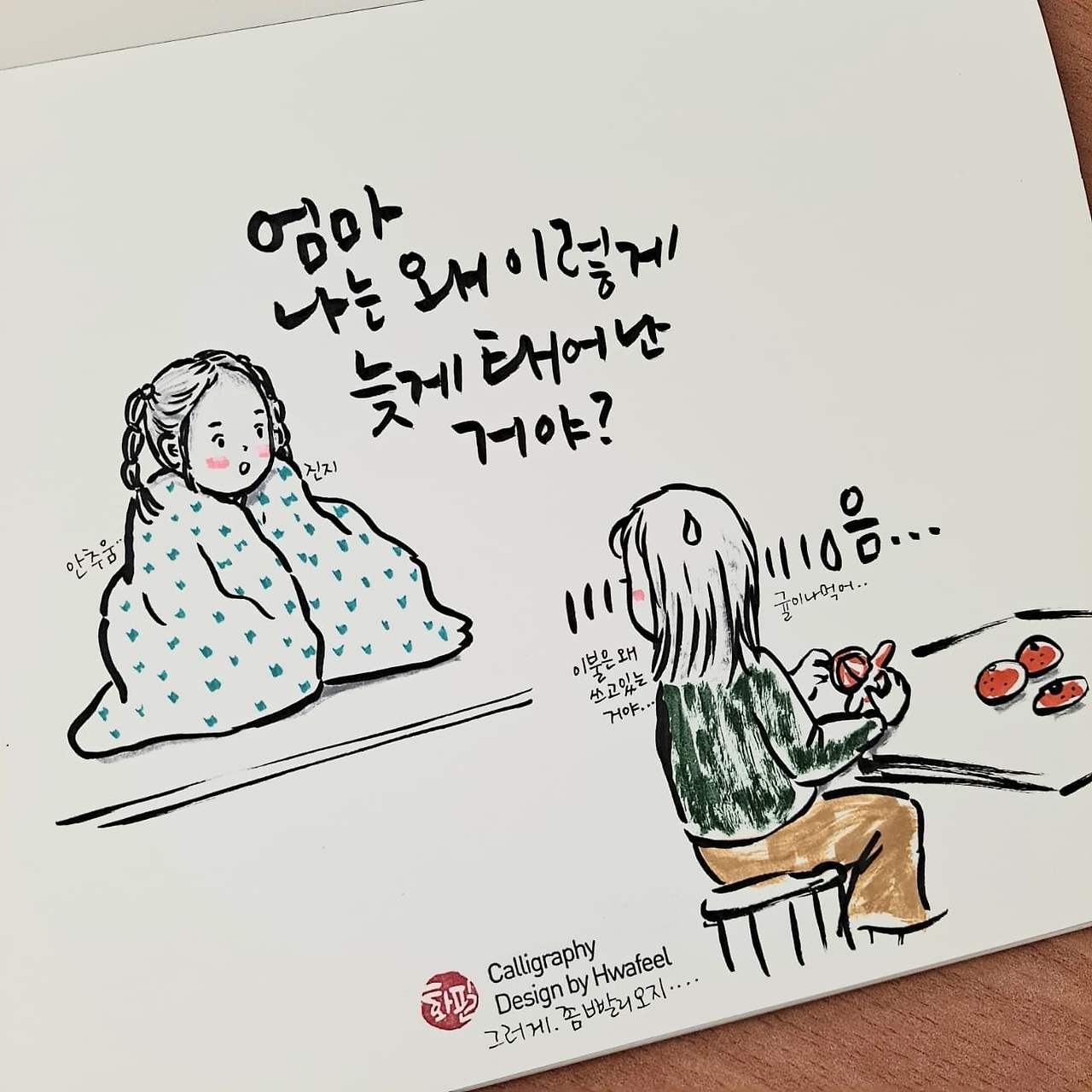 화필의 브런치입니다. 육아하며 캘리그라피를 쓰고 그림을 그립니다. 화필의 육아일기는 간단하고 맛있는 브런치 같은 그림과 글입니다. 가볍게 공감하고 순간을 즐겨 주세요.