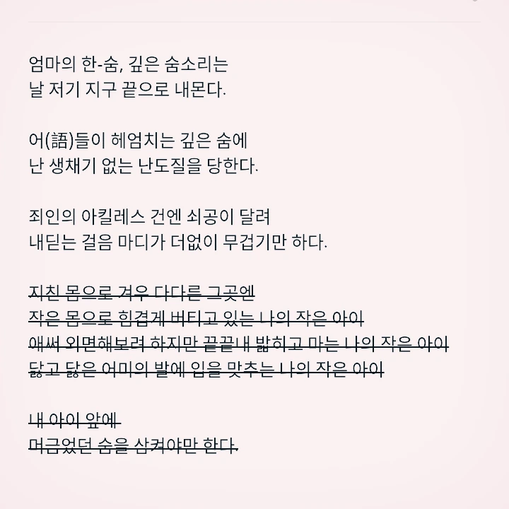 내 경우엔 평상시엔 앓지 않으려 외면을 잘하는 편이다. 그러나 어떠한 노력에도 외면되지 않는 경우가 있는데, 나의 엄마의 한숨을 들을 때면 꼭 그렇다. 죄 많은 딸인지라 엄마의 한이 어린 숨을 들을 때면 그 숨들이 공기를 타고 내게로 와 심장을 조이는 기분이 든다. 저릿하고, 갑갑하다.