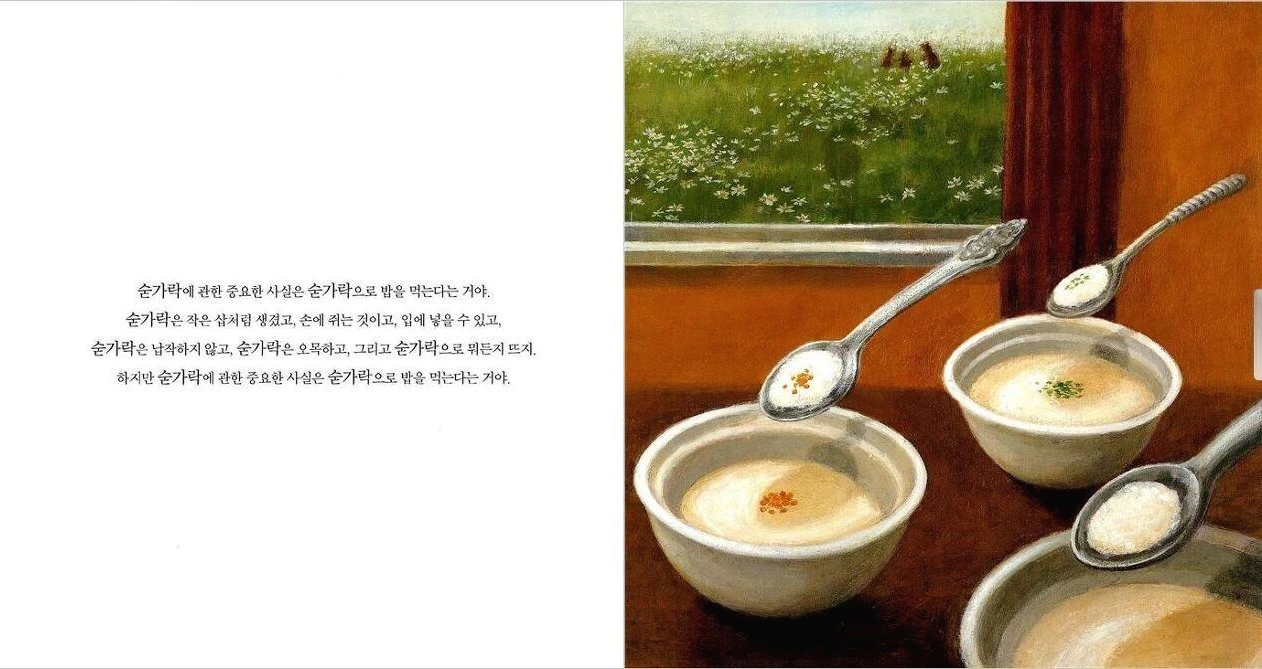 숟가락은 납작하지 않고, 숟가락은 오목하고, 그리고 숟가락으로 뭐든지 뜨지,