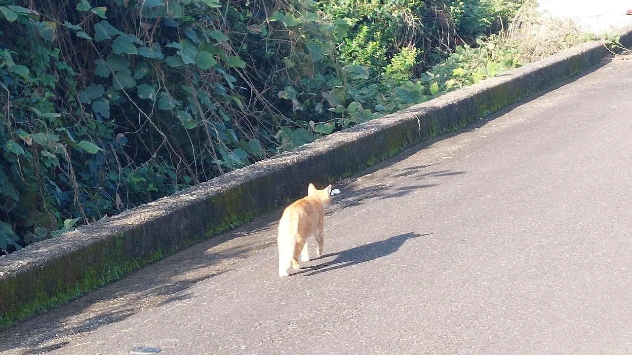 주황색 치즈 고양이 한 마리가 무심한 듯 길을 나섭니다.